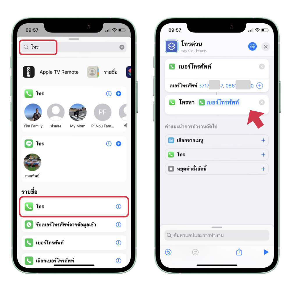 เพิ่มการทำงานด้วยการค้นหาคำว่า โทร อีกครั้ง > เลือก โทร > เราก็จะได้คำสั่งลัดโทรหา โดยอ้างอิงจากเบอร์โทรที่เราเพิ่มการทำงานก่อนหน้า