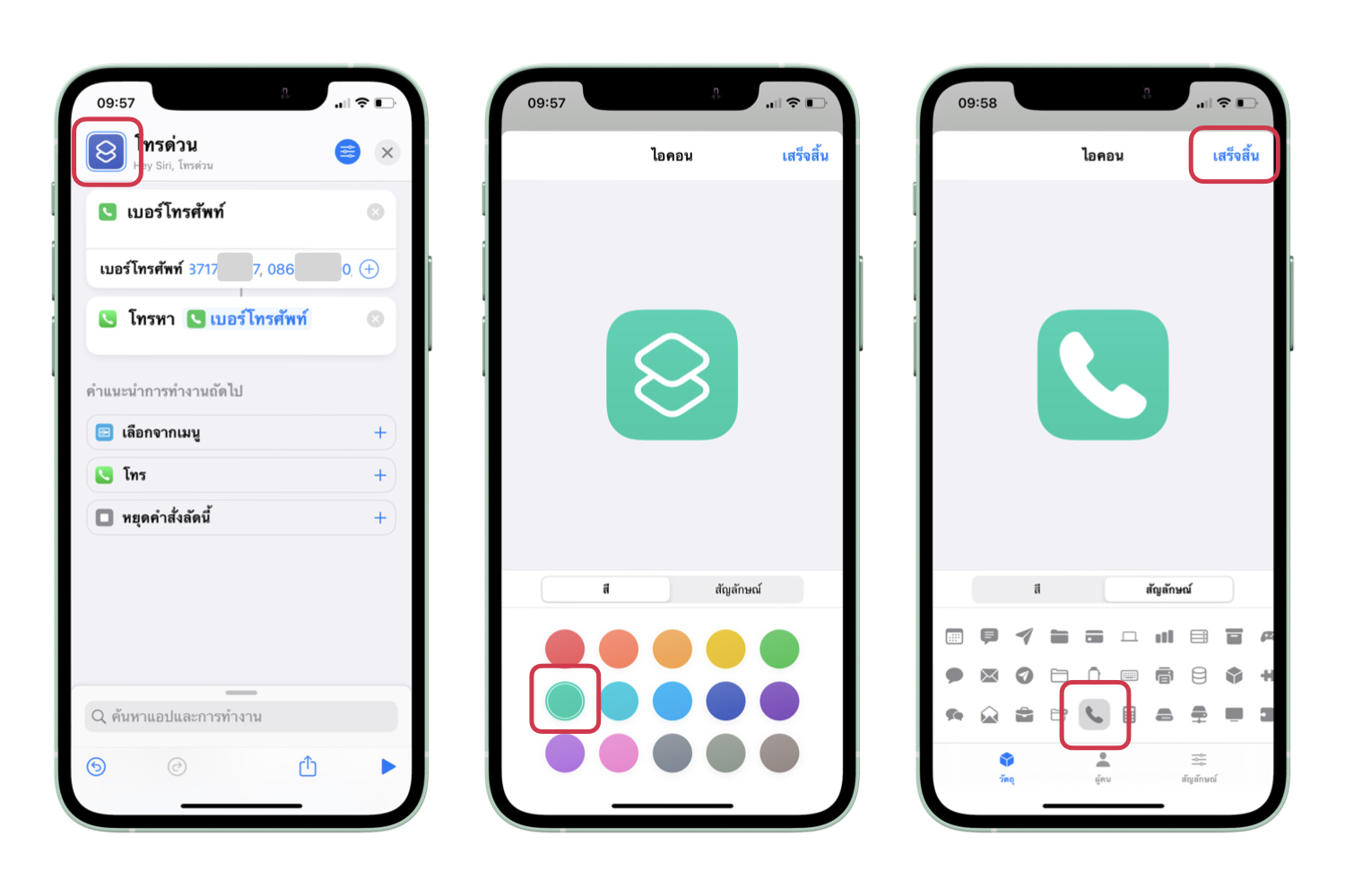 เปลี่ยนไอคอนให้สอดคล้องกับการทำงาน โดยการแตะที่ไอคอนด้านบน > เลือกสี > เลือกไอคอนรูปโทรศัพท์ (หรือจะเลือกไอคอนอื่น ๆ ได้ตามต้องการ) จากนั้นแตะเสร็จสิ้น