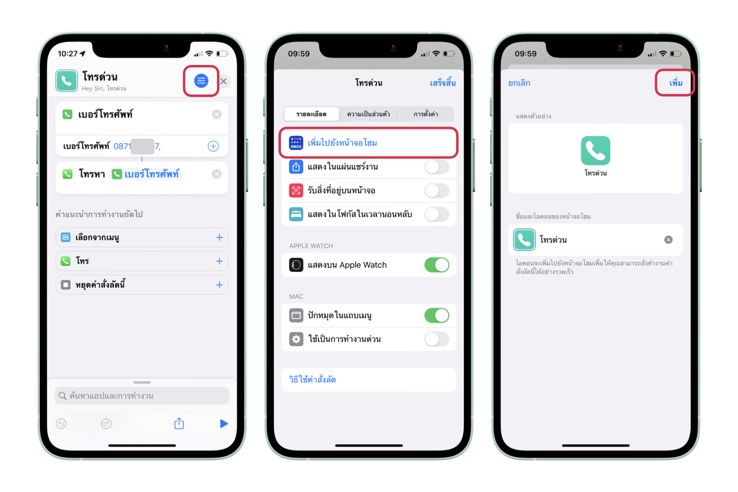 เราก็จะได้คำสั่งลัด โทรด่วน ที่แสดงเป็นวิดเจ็ตบนหน้าโฮม สามารถแตะเพิ่มเริ่มโทรได้เลย นอกจากนี้เรายังสามารถเรียก หวัดดี Siri แล้วตามด้วยคำสั่งโทรด่วน คำสั่งลัดนี้ก็จะทำงานเช่นเดียวกัน