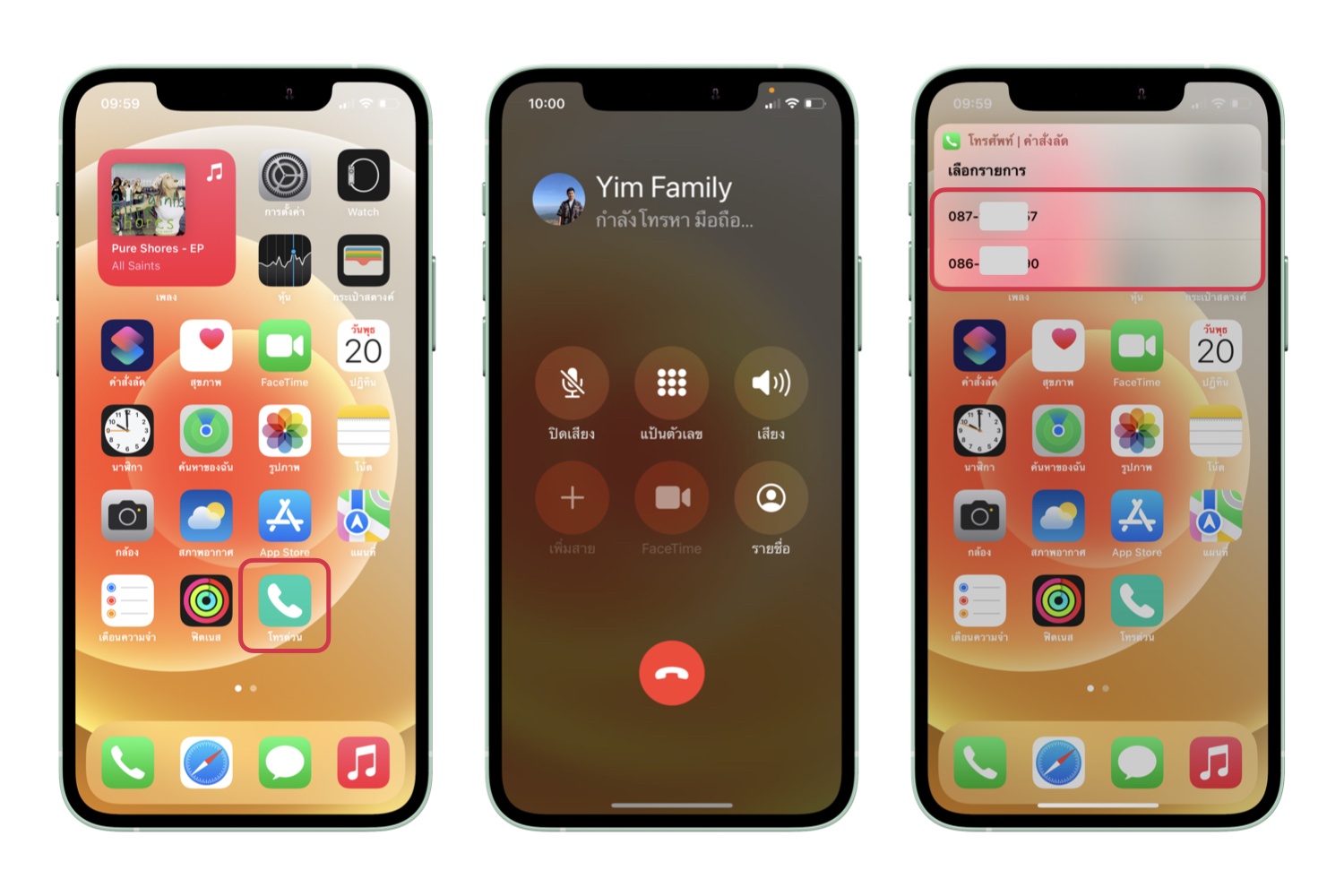 ไอคอนคำสั่งลัดที่เราสร้างไว้ ก็จะถูกเพิ่มไปบนหน้าโฮม ถ้าเราตั้งค่าให้คำสั่งลัดมีเบอร์โทรเบอร์เดียว เมื่อแตะที่ไอคอนคำสั่งลัดโทรด่วน iPhone ก็จะเริ่มโทรหาเบอร์นั้นทันที แต่ถ้าหากเรากำหนดไว้หลายเบอร์โทร เมื่อแตะคำสั่งลัดโทรด่วน iPhone จะแสดงเบอร์โทรที่กำหนดไว้ให้เลือกก่อน เราก็แตะเบอร์ที่ต้องการโทรได้เลย