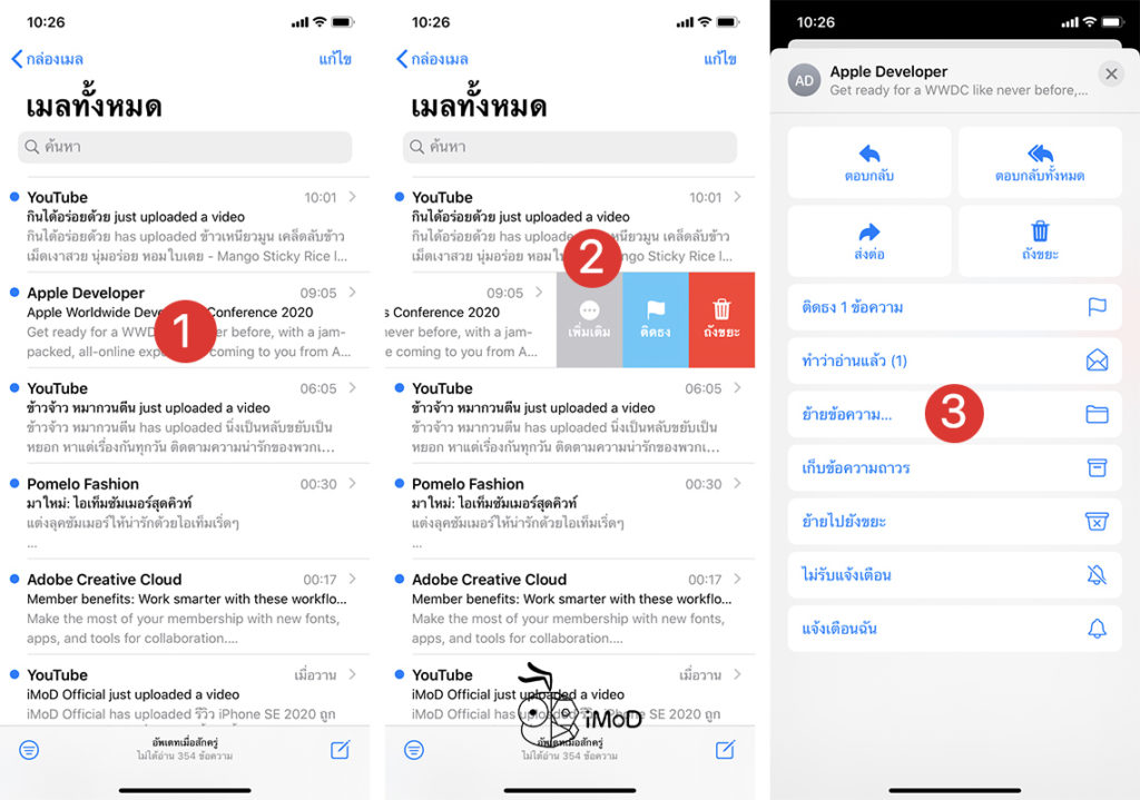 เมื่อต้องการจัดระเบียบอีเมล ก็สามารถย้ายอีเมลไปเก็บในแต่ละโฟลเดอร์ได้ โดยปัดอีเมลไปทางซ้าย > แตะเพิ่มเติม (More) > ย้ายข้อความ