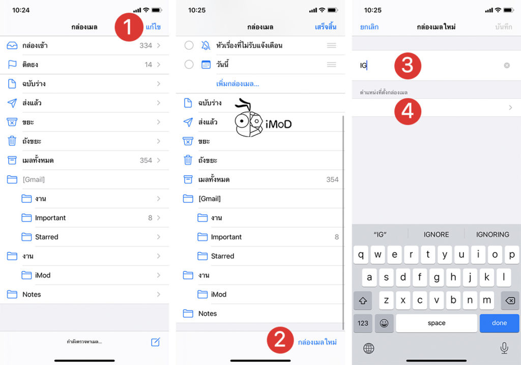 ไปที่แอปเมล (Mail) > แตะ แก้ไข (Edit) > กล่องเมลใหม่ > ตั้งชื่อโฟลเดอร์ แล้วเลือกตำแหน่งที่ตั้งของกล่องเมล