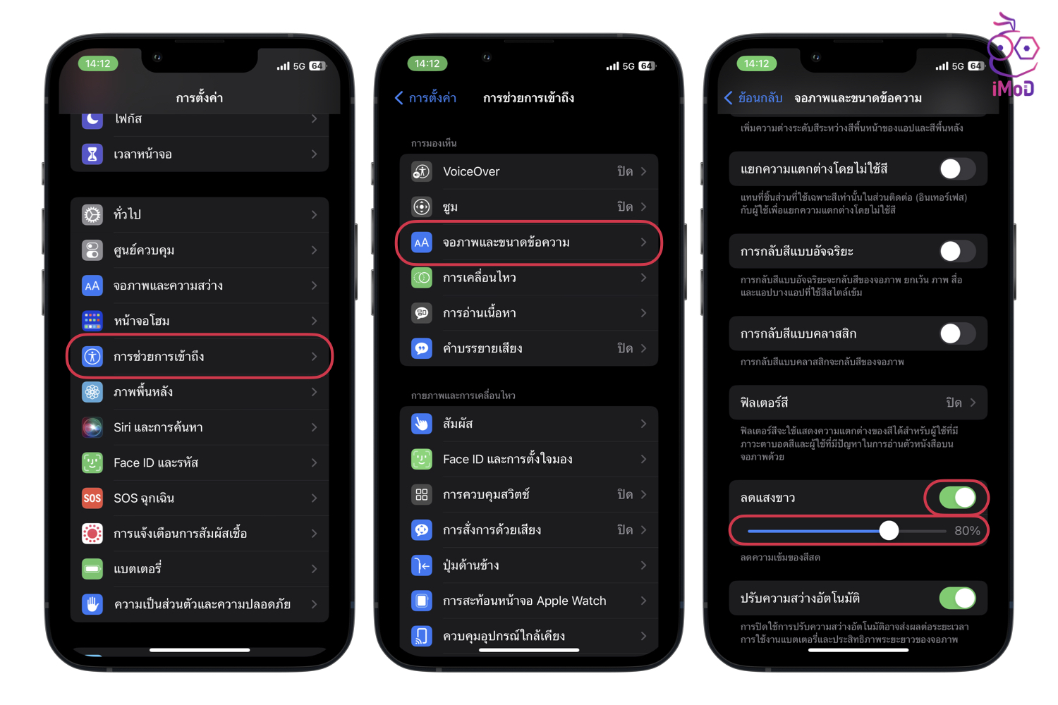 เริ่มต้นด้วยการตั้งค่าการลดแสงขาวให้เรียบร้อยก่อน ไปที่ การตั้งค่า > การช่วยการเข้าถึง > จอภาพและขนาดข้อความ > เปิด ลดแสงขาว และปรับการลดแสงขาวประมาณ 80%-86%