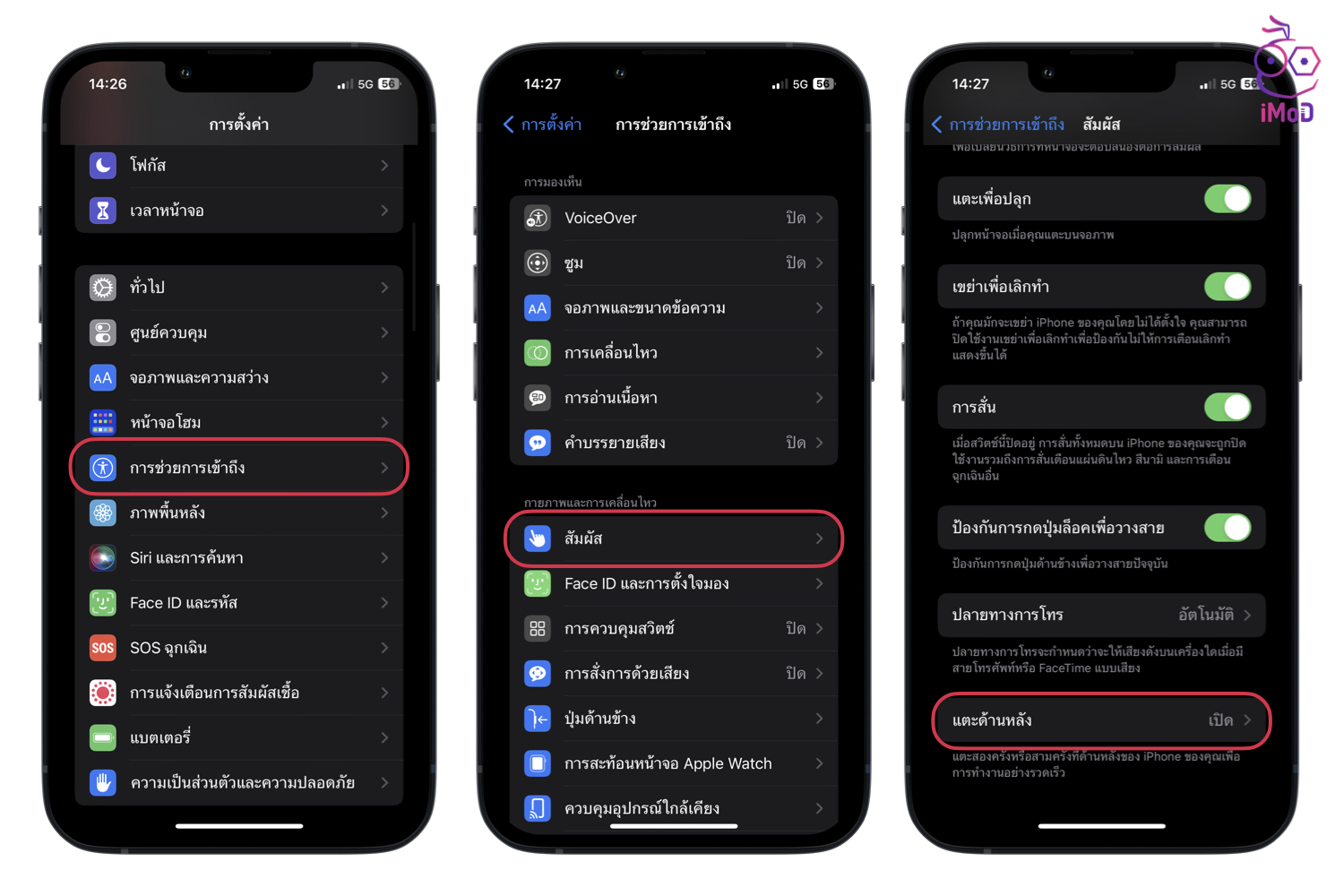 ไปที่ การตั้งค่า > การช่วยการเข้าถึง > สัมผัส > แตะด้านหลัง