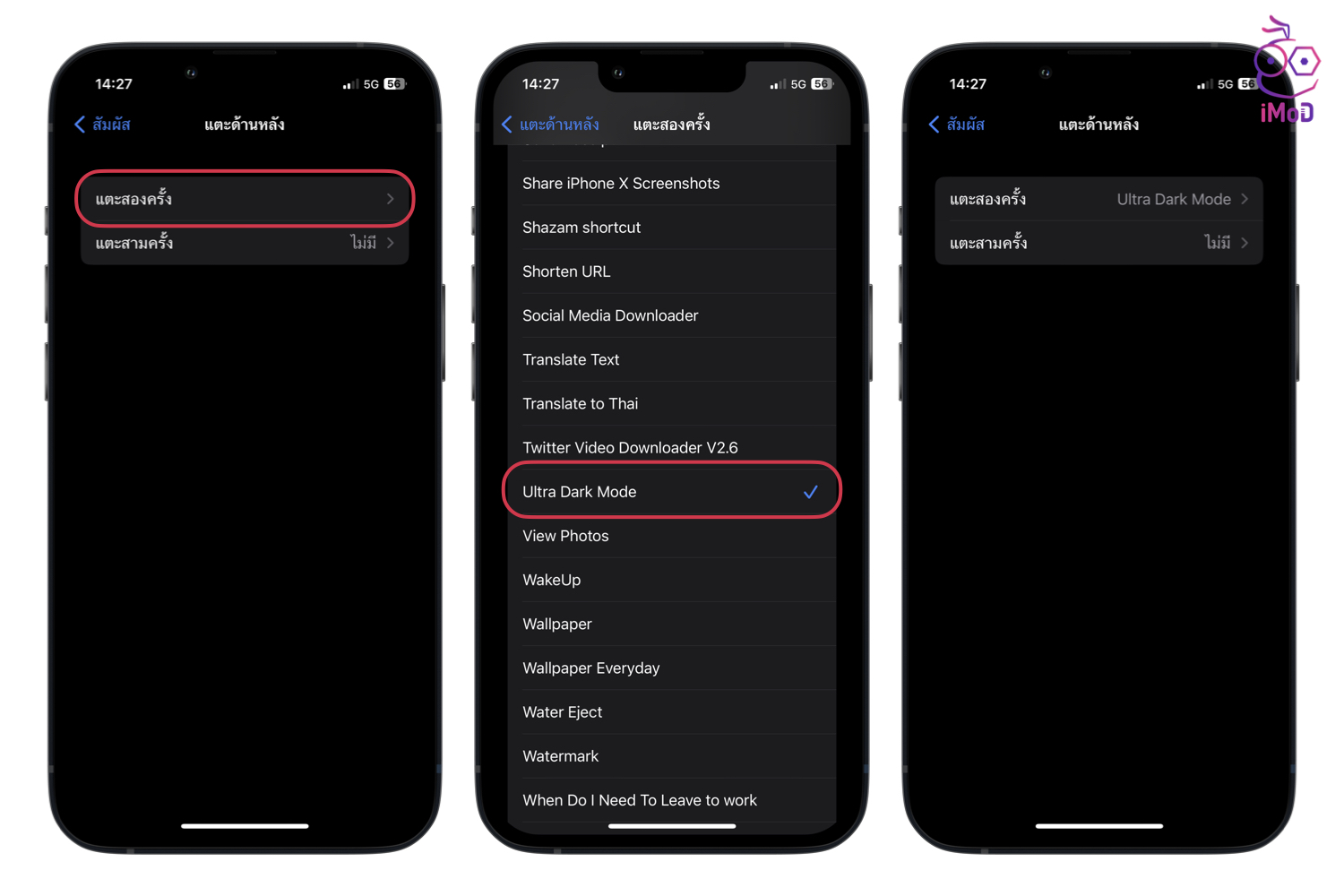 เลือก แตะสองครั้ง > เลือกคำสั่งลัด Ultra Dark Mode ที่เราสร้างไว้