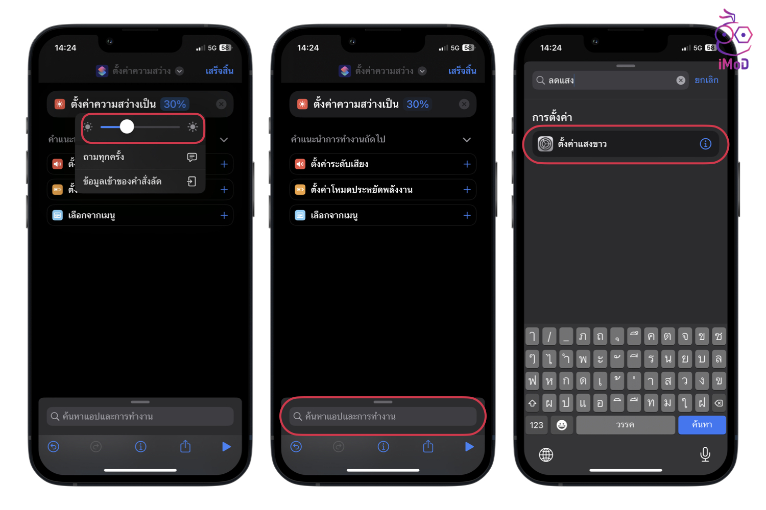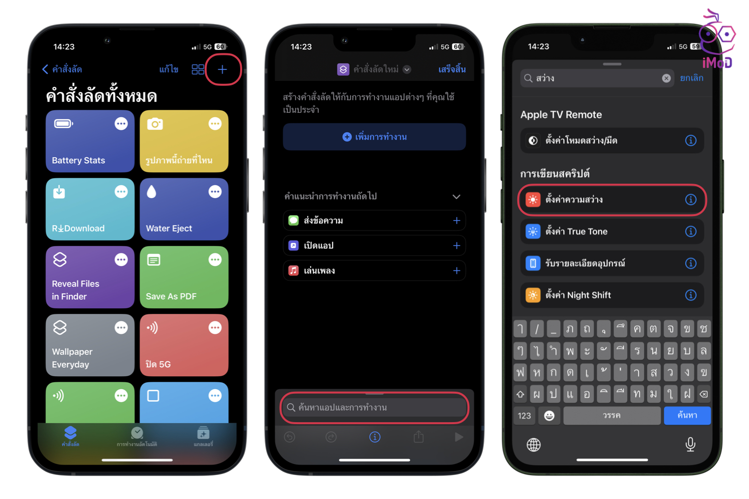 จากนั้นให้เราไปสร้างคำสั่งลัดสำหรับการเปิดใช้งาน Ultra Dark Mode โดยไปที่แอปคำสั่งลัด (Shortcuts) > แตะเพิ่มคำสั่งลัดด้านบนขวา > แตะส่วนค้นหา > ค้นหาและเลือกเมนู ตั้งค่าความสว่าง