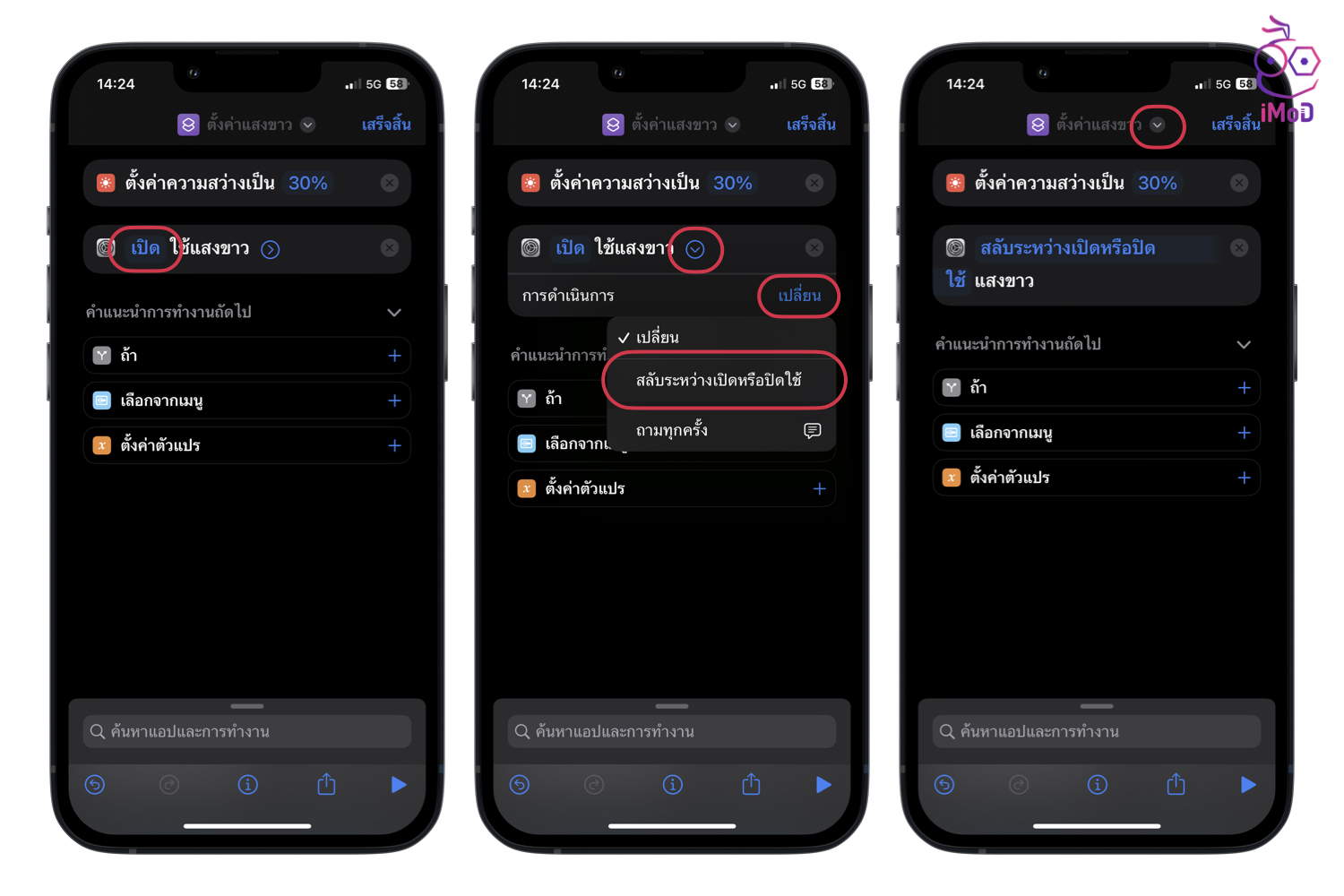 ให้เปิดการใช้แสงขาว > แตะไอคอนลูกศรด้านหลัง แล้วเลือก เปลี่ยน > เลือก สลับระหว่างเปิดหรือปิดใช้ > จากนั้นให้แตะลูกศรด้านบนเพื่อเปลี่ยนชื่อและไอคอนคำสั่งลัด