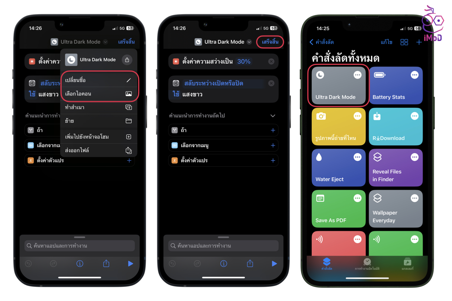 เปลี่ยนชื่อคำสั่งลัดเป็น Ultra Dark Mode และเลือกไอคอนที่สอดคล้องกับคำสั่ง > แตะเสร็จสิ้น > เราก็จะได้คำสั่งลัด Ultra Dark Mode ที่จะมาช่วยปรับหน้าจอของเราให้มืดลง เวลาที่ใช้งาน iPhone ในที่มืด