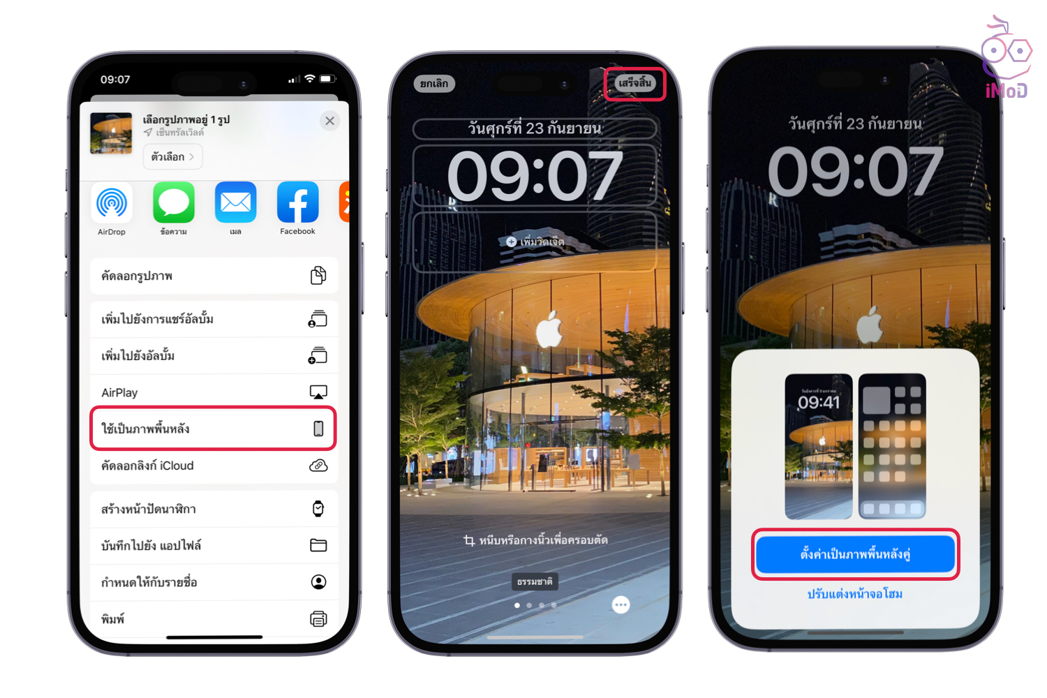 แตะไอคอนครอปรูปภาพด้านบน แล้วแตะ ภาพพื้นหลัง (Wallpaper) ด้านล่าง > ใช้ 2 นิ้ว ย่อ ขยาย หรือเลื่อนตำแหน่งที่ต้องการ แล้วแตะ เสร็จสิ้น (Done) > หากต้องการตั้งเป็นภาพพื้นหลัง ให้แตะไอคอน แชร์ ด้านล่าง
