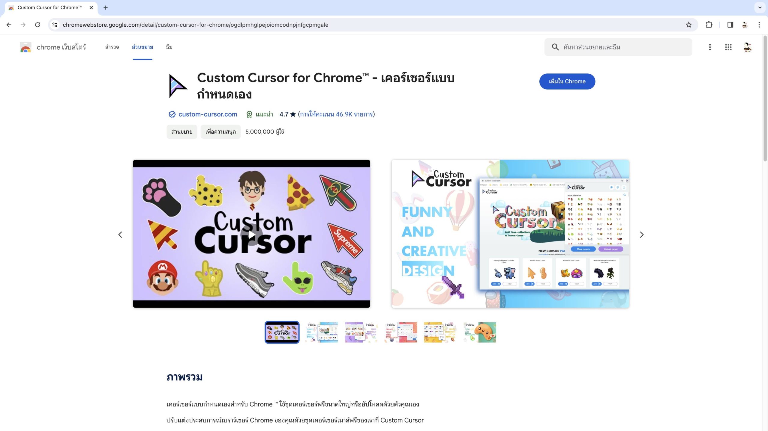 ให้มาที่ส่วนขยาย 👉🏻 Custom Cursor for Chrome แล้วกด “เพิ่มส่วนขยาย”