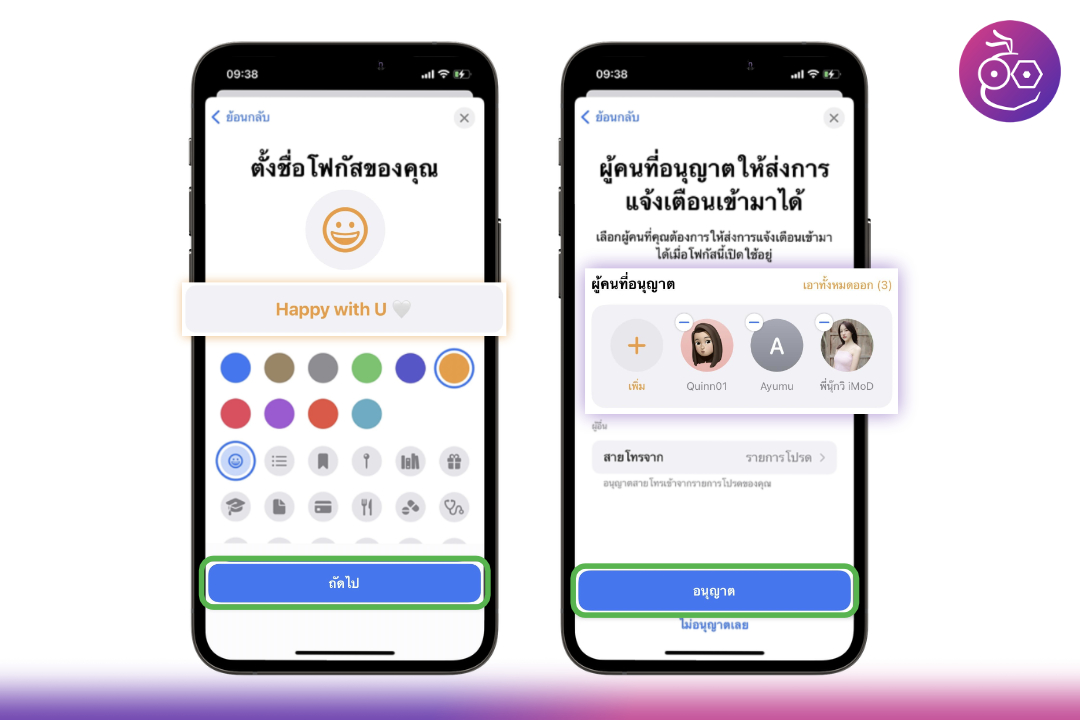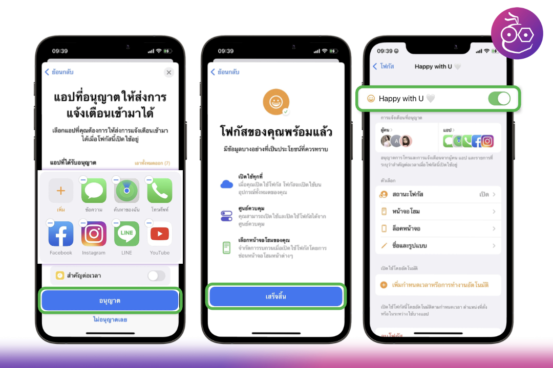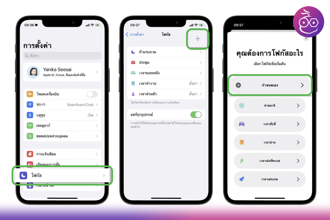 ตั้งชื่อโฟกัสของคุณ > เลือกอิโมจิ/ไอคอนที่คุณต้องการใช้ จากนั้นแตะ ถัดไป > เลือกว่าใครสามารถส่งการแจ้งเตือนถึงเข้ามาได้ จากนั้นแตะอนุญาต