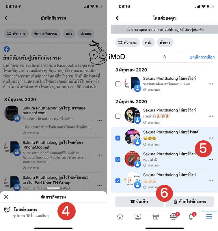 แตะเลือก โพสต์ของคุณ (Yout Posts) > หากต้องการลบโพสต์ ให้ติ๊กเลือกโพสต์ที่ต้องการ แล้วเลือกย้ายไปถังขยะ (Trash) ได้เลย (หากต้องการจัดเก็บ เพื่อซ่อนออกจากไทม์ไลน์ ให้แตะ จัดเก็บ (Archive))