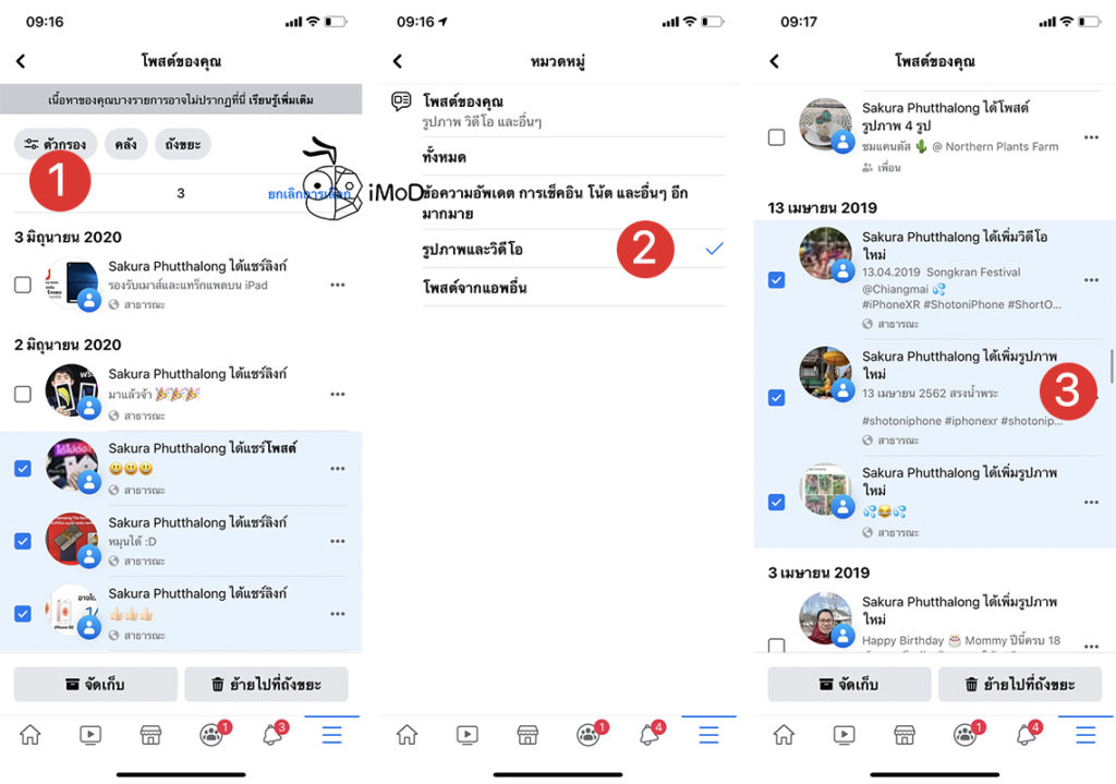 นอกจากนี้เรายังสามารถเลือกกรองโพสต์ที่ต้องการได้ง่าย ๆ ด้วยการแตะ ตัวกรอง (Filter) แล้วเลือกการกรองได้เลย มีทั้งกรอกตามหมวดหมู่ วันที่ และผู้คน > ตัวอย่างเลือกกรองตามหมวดหมู่ โดยเลือกเฉพาะโพสต์ที่มีรูปภาพและวิดีโอ > จากนั้นก็เลือกโพสต์ที่ต้องการ แล้วย้ายไปถังขยะ (Trash) หรือจัดเก็บ (Archive) ได้เลย