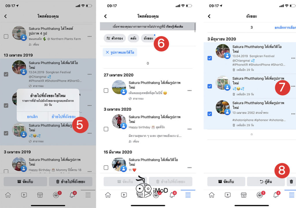 หากย้ายไปถังขยะก็ยืนยันอีกครั้ง > สามารถดูโพสต์ที่ย้ายโดยแตะเลือก ถังขยะ (Trash) > เราก็จะเห็นโพสต์ที่ย้ายมา หากต้องการลบออกจาก Facebook ให้แตะรูปถังขยะ แต่หากต้องการกู้คืนก็สามารถแตะ กู้คืนได้เลย