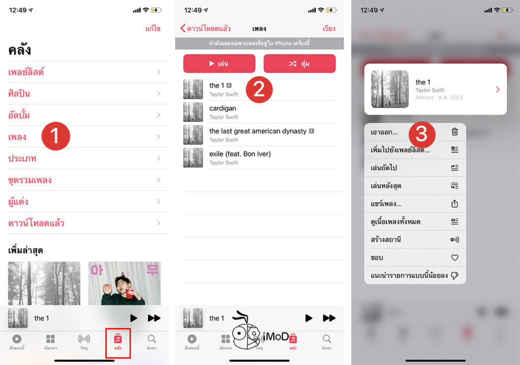 ไปที่แอป Apple Music > คลัง (Library) > เลือกเพลง หรือตัวเลือกอื่น ๆ จากคลัง > แตะค้างที่รายการเพลงที่ต้องการลบ > เลือก เอาออก (Remove)