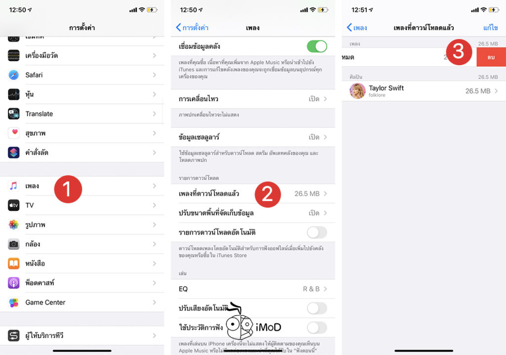 ไปที่การตั้งค่า (Settings) > เพลง (Song) > เพลงที่ดาวน์โหลดแล้ว (Downloaded Music) > ปัด เพลงทั้งหมด ไปทางซ้าย แล้วแตะลบ