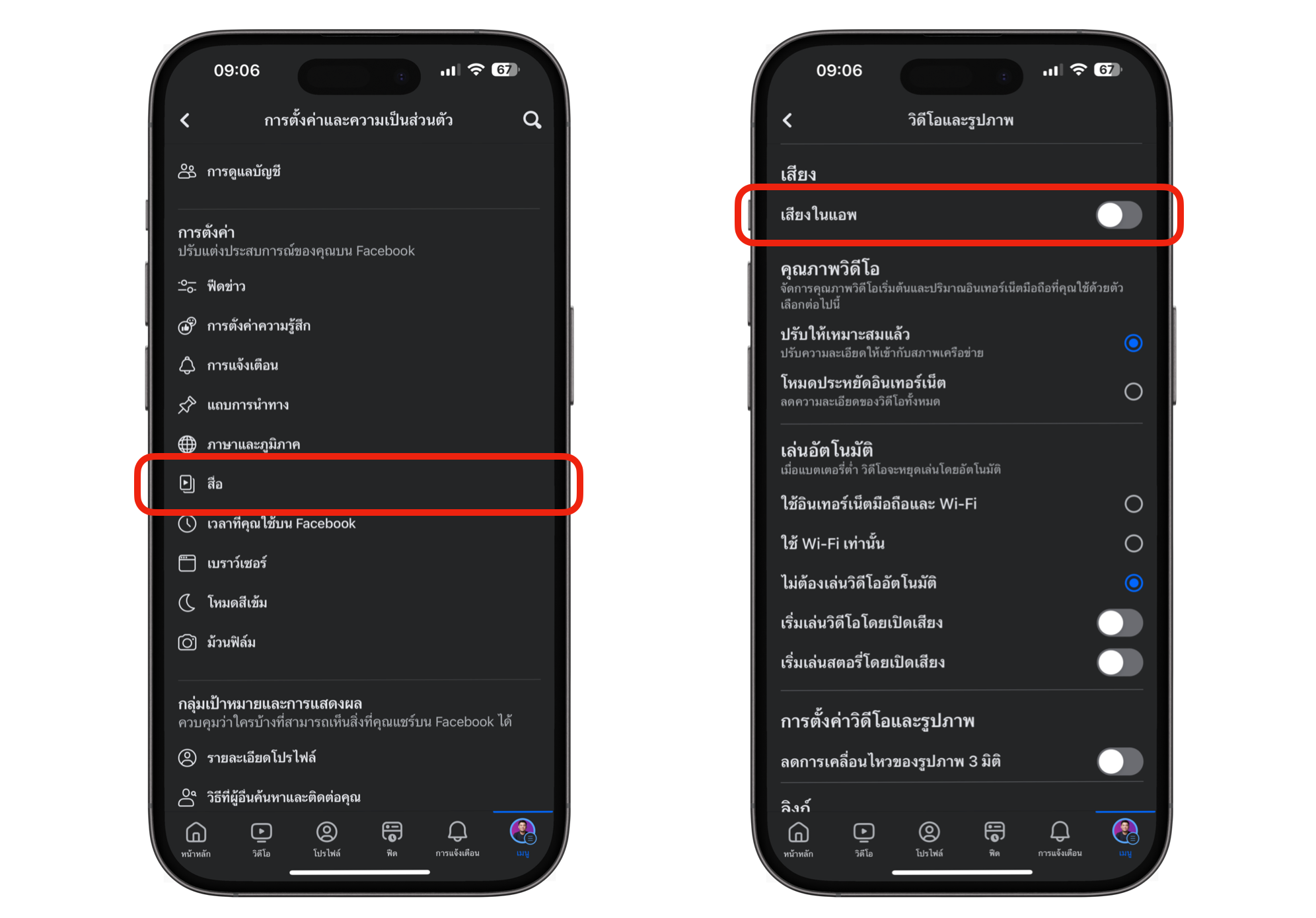 แตะ “สื่อ” > เลื่อนปิด “เสียงในแอป”
