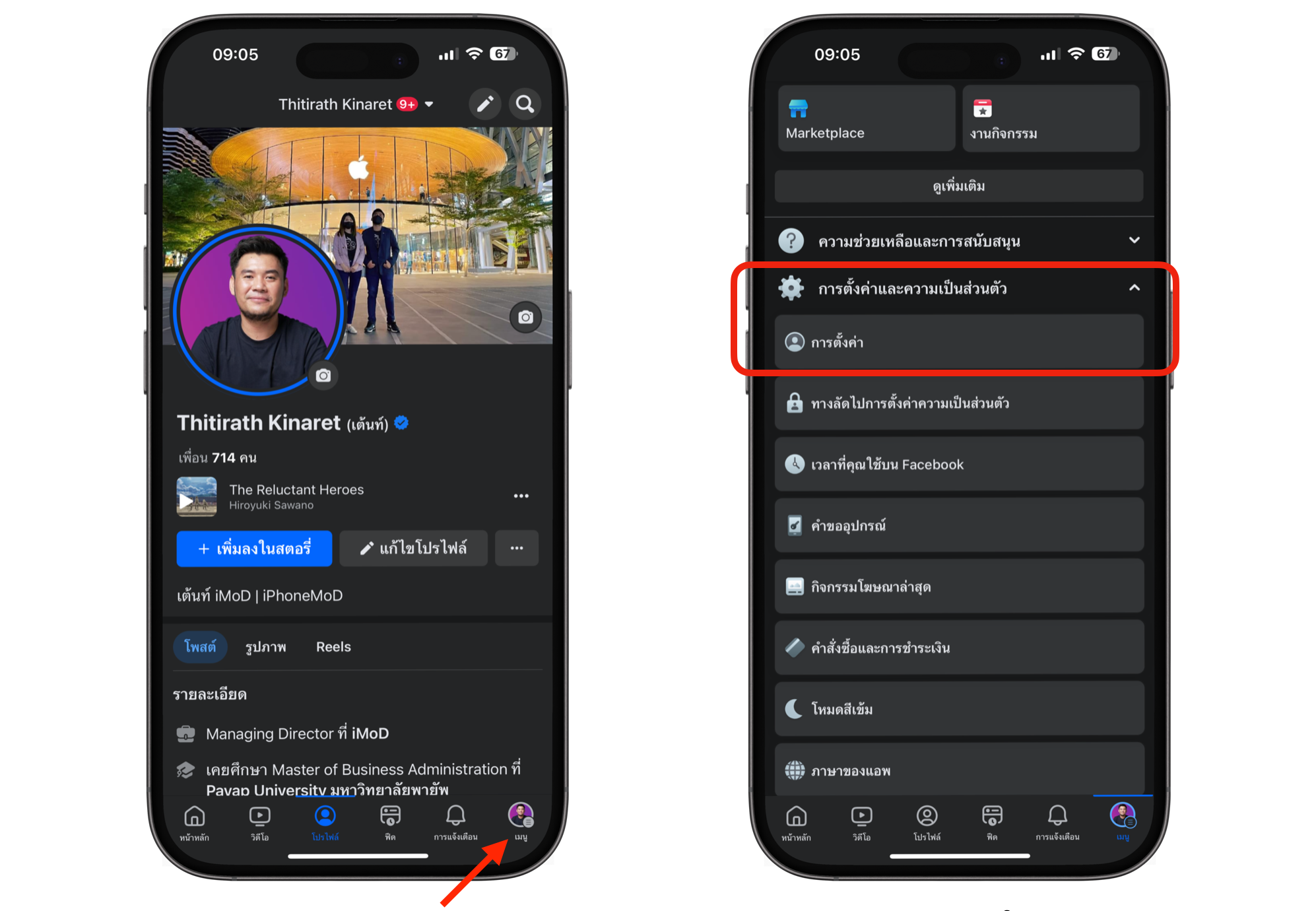 แตะ “เมนู” ล่างขวา > แตะ “การตั้งค่าและความเป็นส่วนตัว”  > การตั้งค่า
