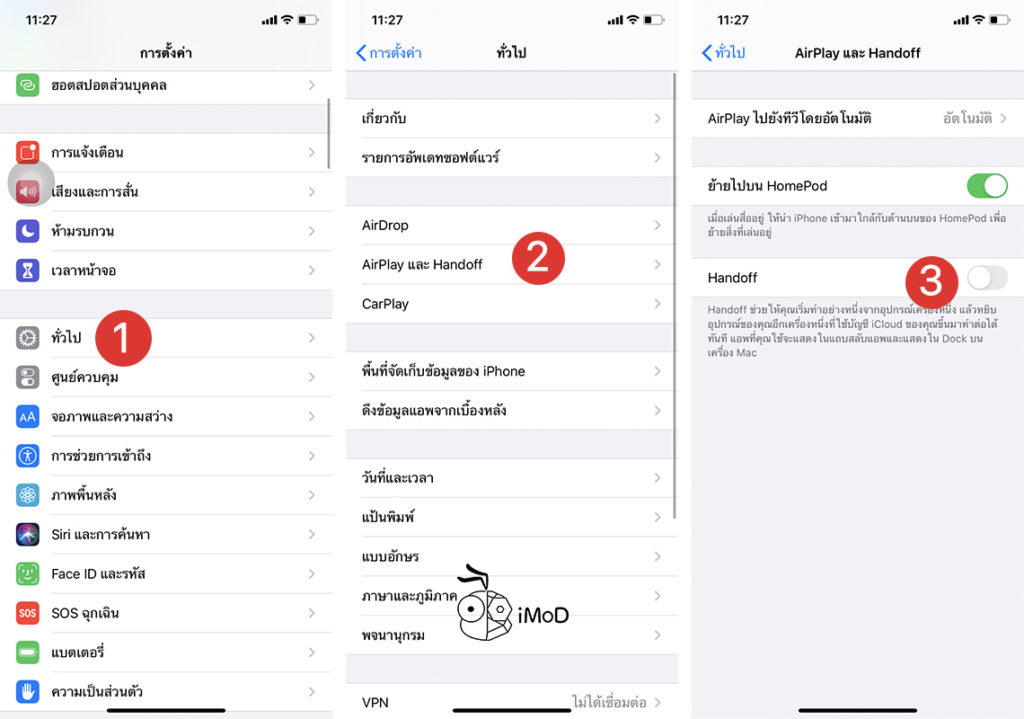 สำหรับ iPhone และ iPad ให้ไปที่ การตั้งค่า (Settings) > ทั่วไป (General) > AirPlay และ Handoff > ปิด Handoff