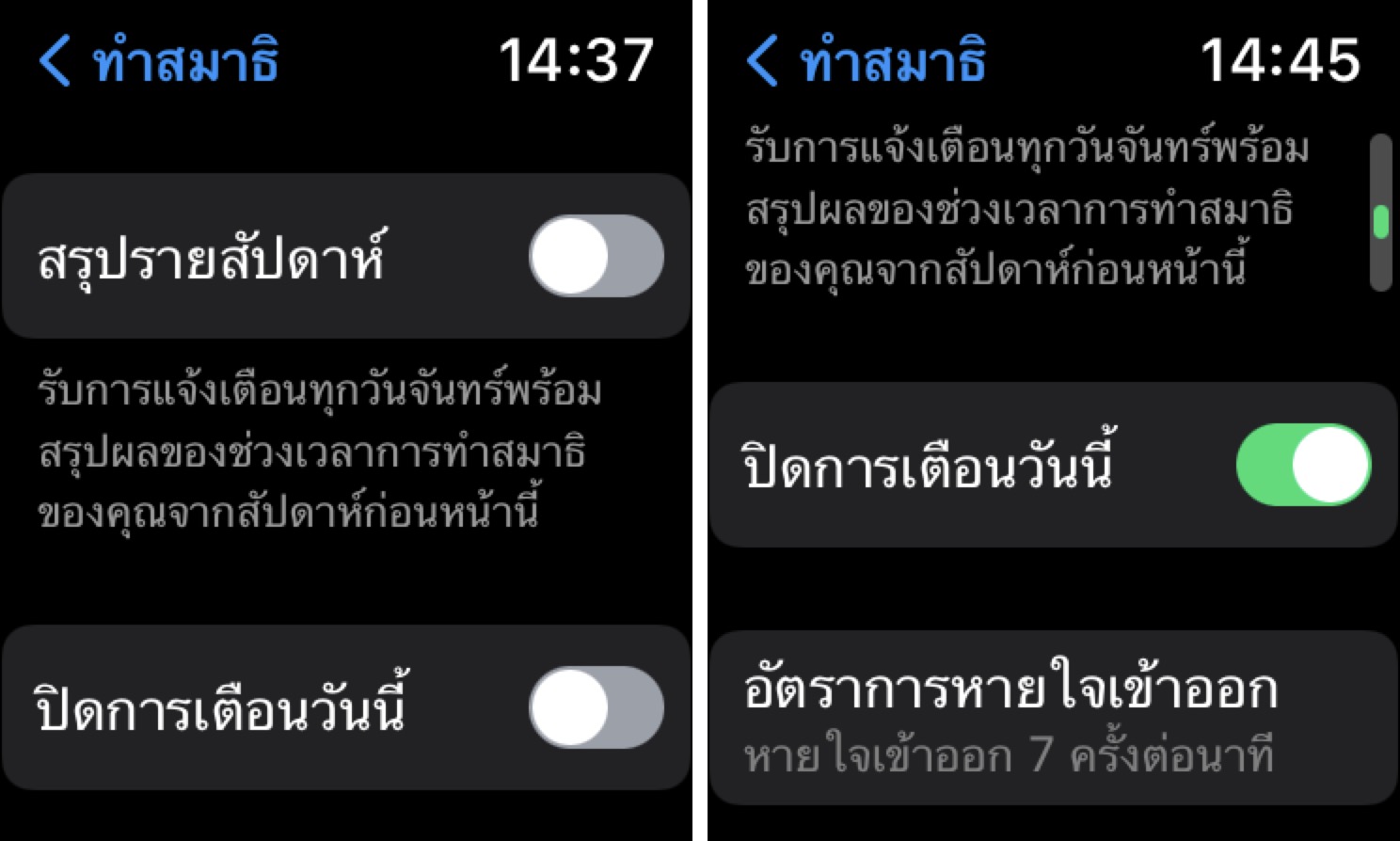 ฟีเจอร์การทำสมาธิบน Apple Watch มีประโยชน์มาก หากไม่รบกวนผู้ใช้มากแนะนำให้เปิดไว้และปฏิบัติตามคำแนะนำของตัวแอป การฝึกทำสมาธิช่วยให้เราจิตใจสงบลง มีสติมากขึ้น