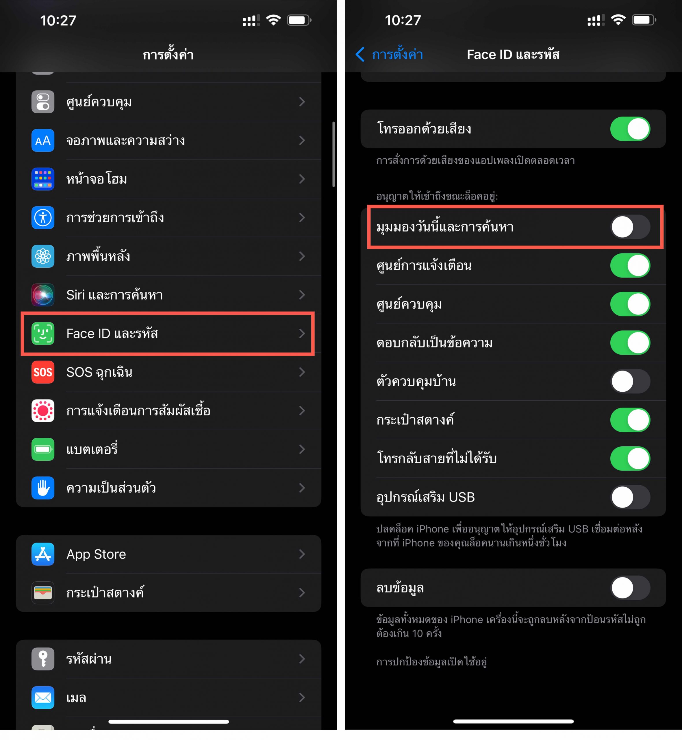 ไปที่การตั้งค่า > Face ID และรหัส (หรือ Touch ID และรหัส) > เลื่อนปิด “มุมมองวันนี้และการค้นหา”