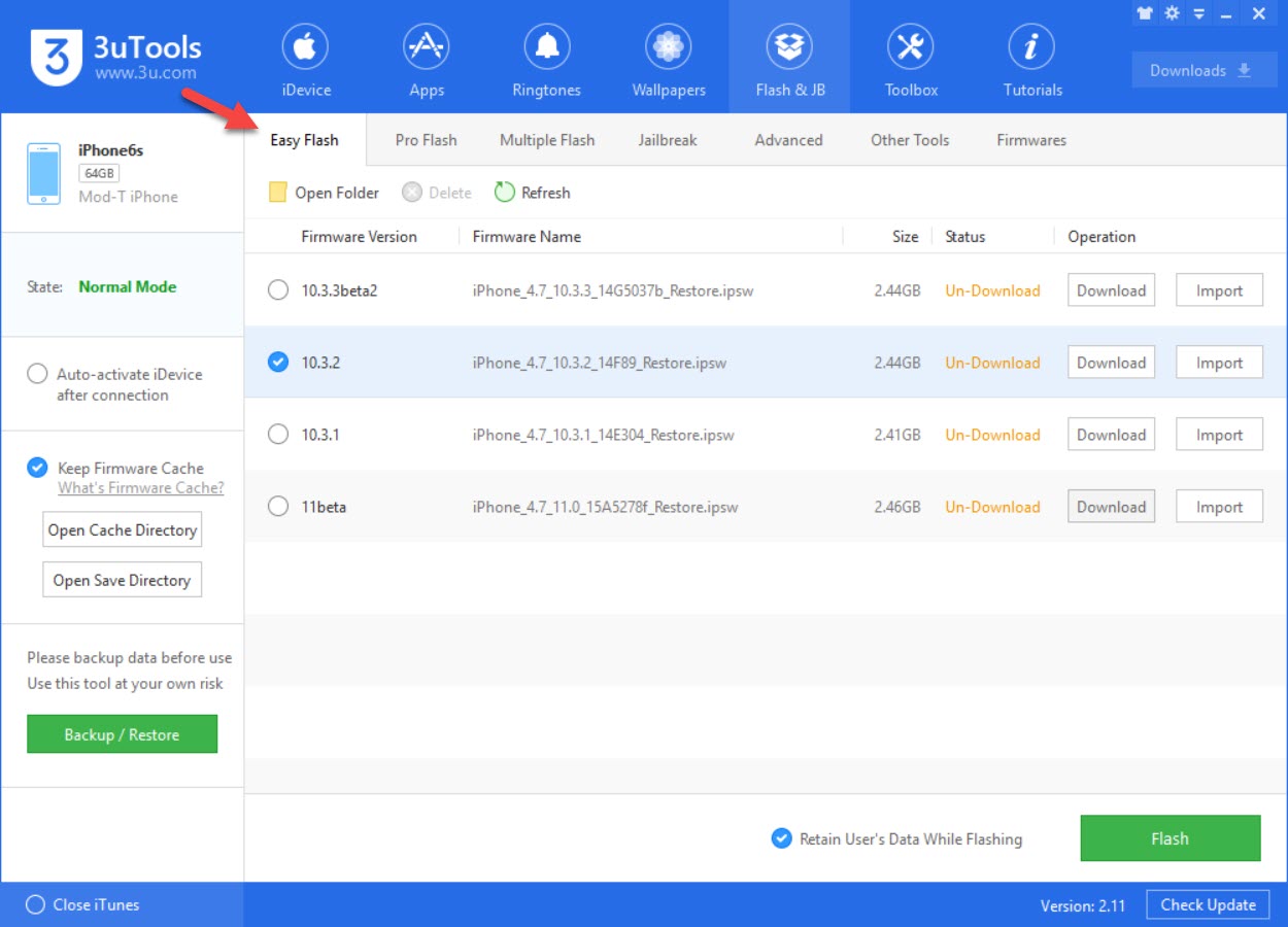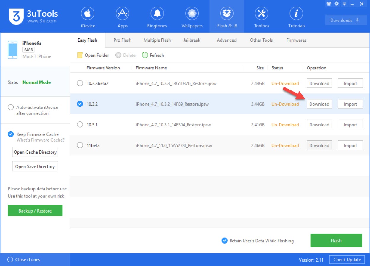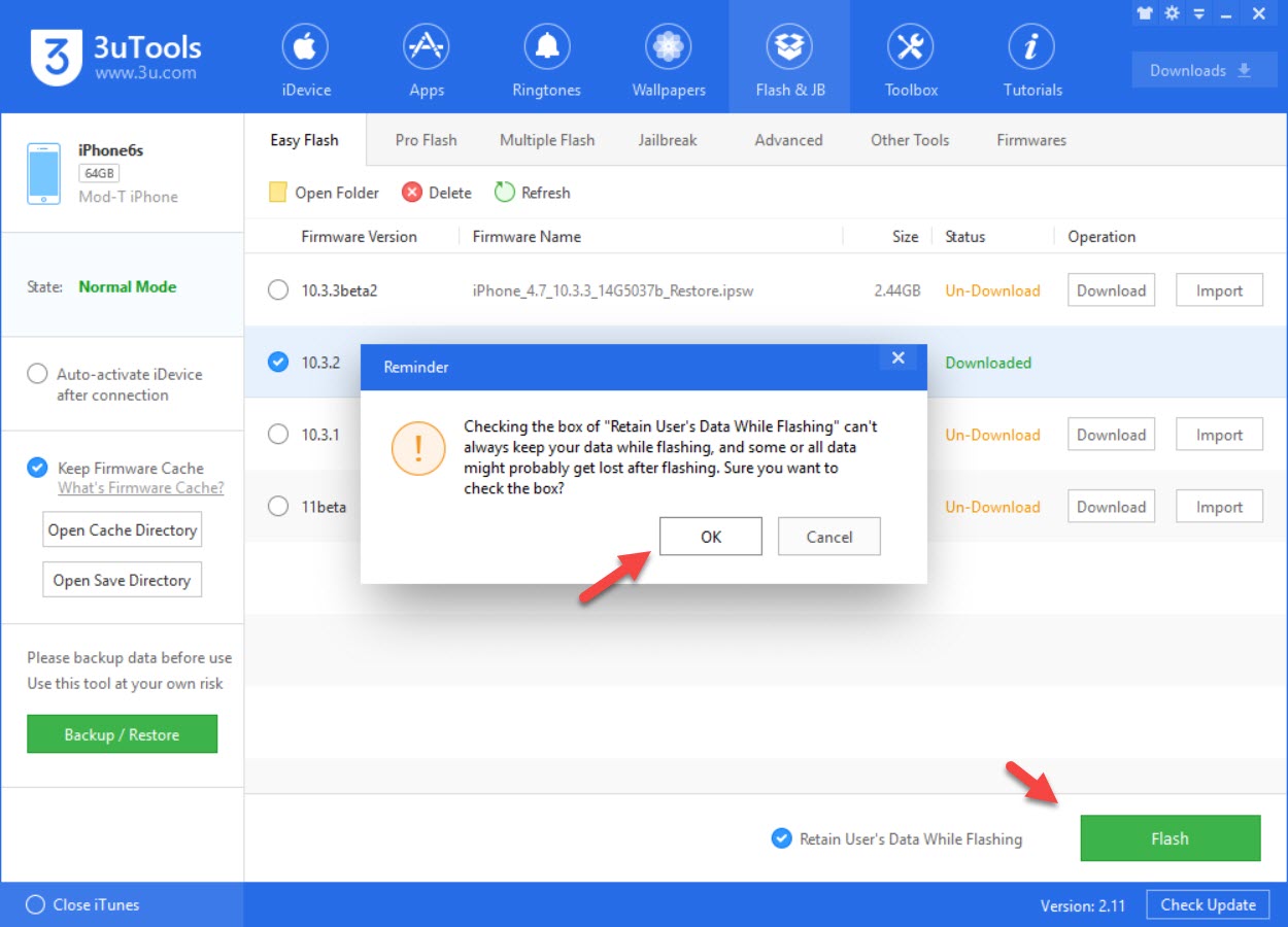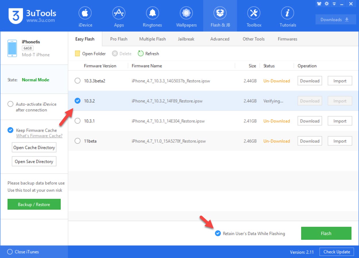 3. คลิกที่ iOS 10.3.2 (หรืออื่นๆ ที่ต้องการดาวน์เกรดกลับไป) > สำคัญมาก!! คลิกที่ Retain User’s Data While Flashing เพื่อป้องกันข้อมูลสูญหาย (บางส่วน)