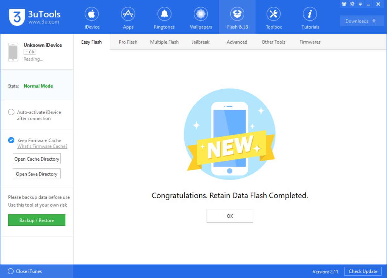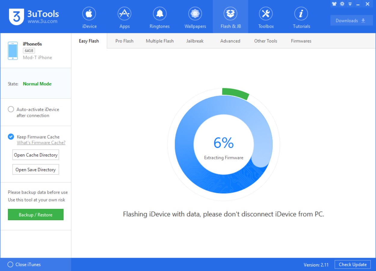 1. เชื่อมต่อ iPhone, iPad กับคอมพิวเตอร์ > เปิดโปรแกรม 3uTools ขึ้นมา > เลือก Flash & JB > Easy Flash
