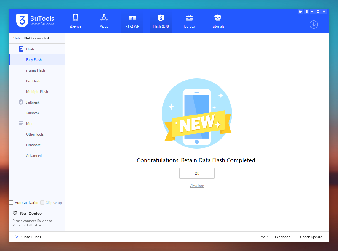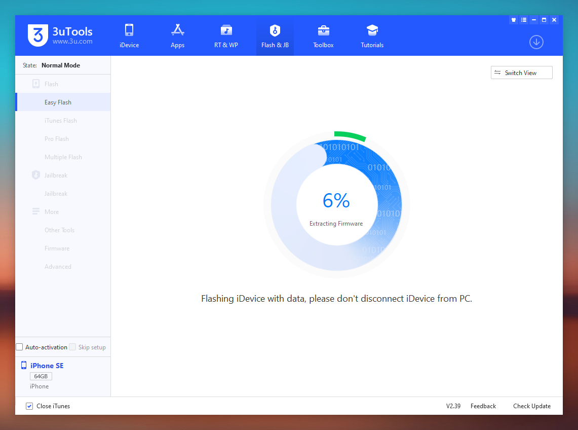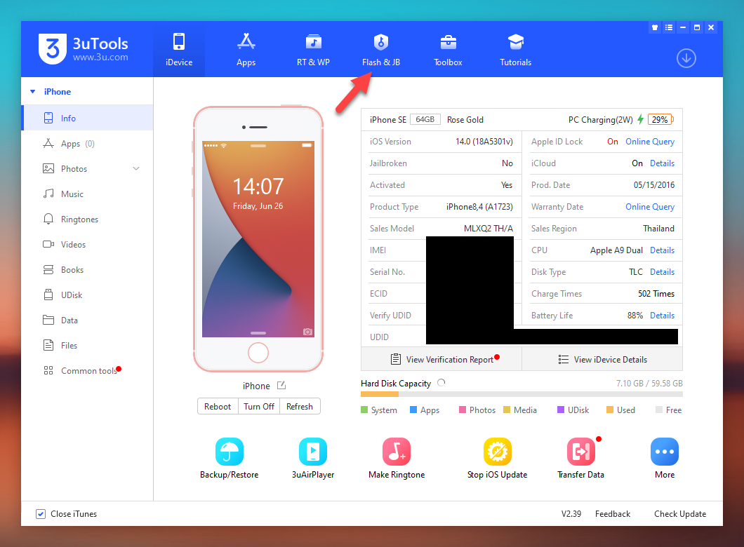 1. เชื่อมต่อ iPhone กับคอมพิวเตอร์ > เปิดโปรแกรม 3uTools ขึ้นมา > เลือก Flash & JB > Easy Flash