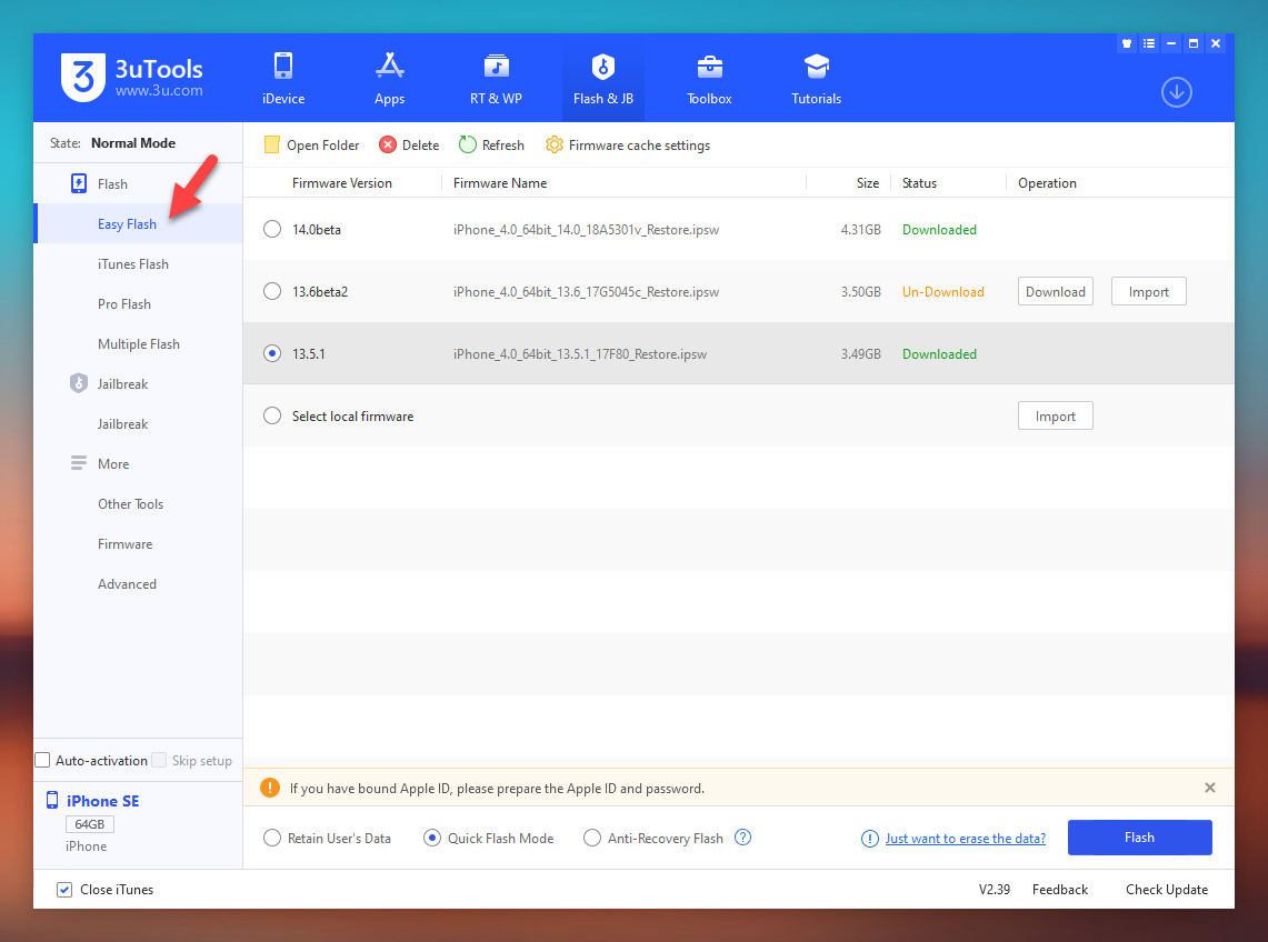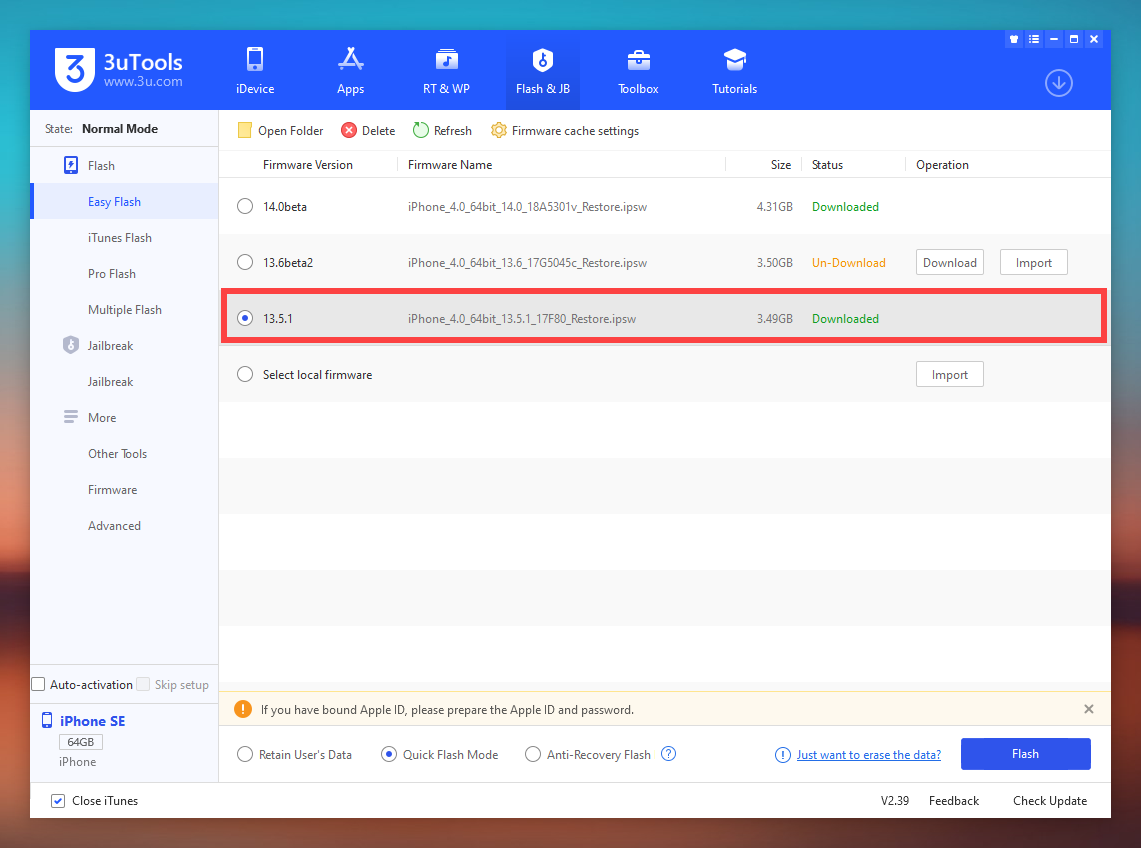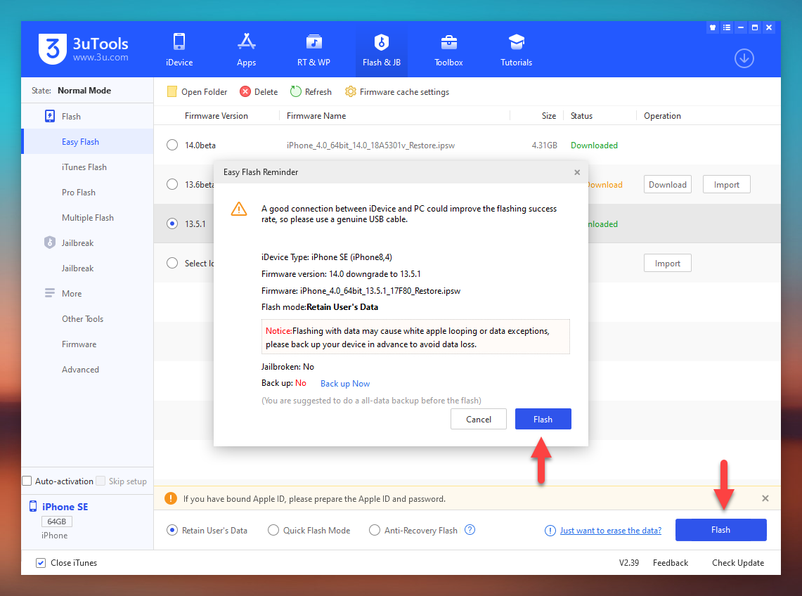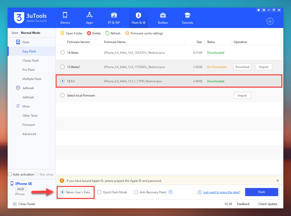 3. คลิกที่ iOS 13.5.1 (หรืออื่นๆ ที่ต้องการดาวน์เกรดกลับไป) > สำคัญมาก!! คลิกที่ Retain User’s Data While Flashing เพื่อป้องกันข้อมูลสูญหาย (บางส่วน)