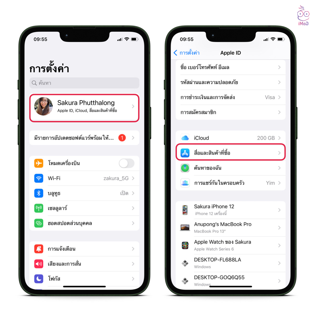 ไปที่ การตั้งค่า (Settings) > Apple ID > สื่อและสินค้าที่ซื้อ (Media & Purchases)