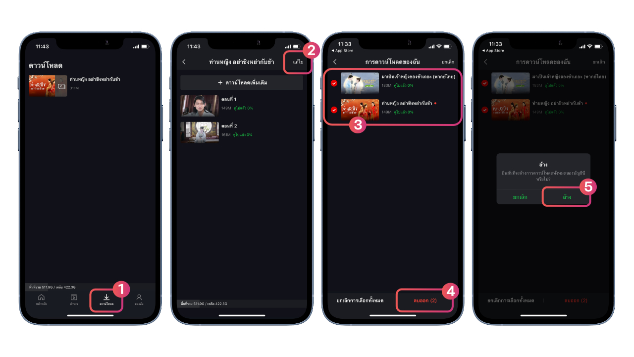 เมื่อเราดูจนจบแล้วก็สามารถลบรายการดาวน์โหลดได้ โดยไปที่หน้า Download > แตะไอคอนรูปปากกา > แตะสี่เหลี่ยมกากบาทในช่องวิดีโอที่ต้องการลบ > แตะ “done” เป็นอันเสร็จสิ้น