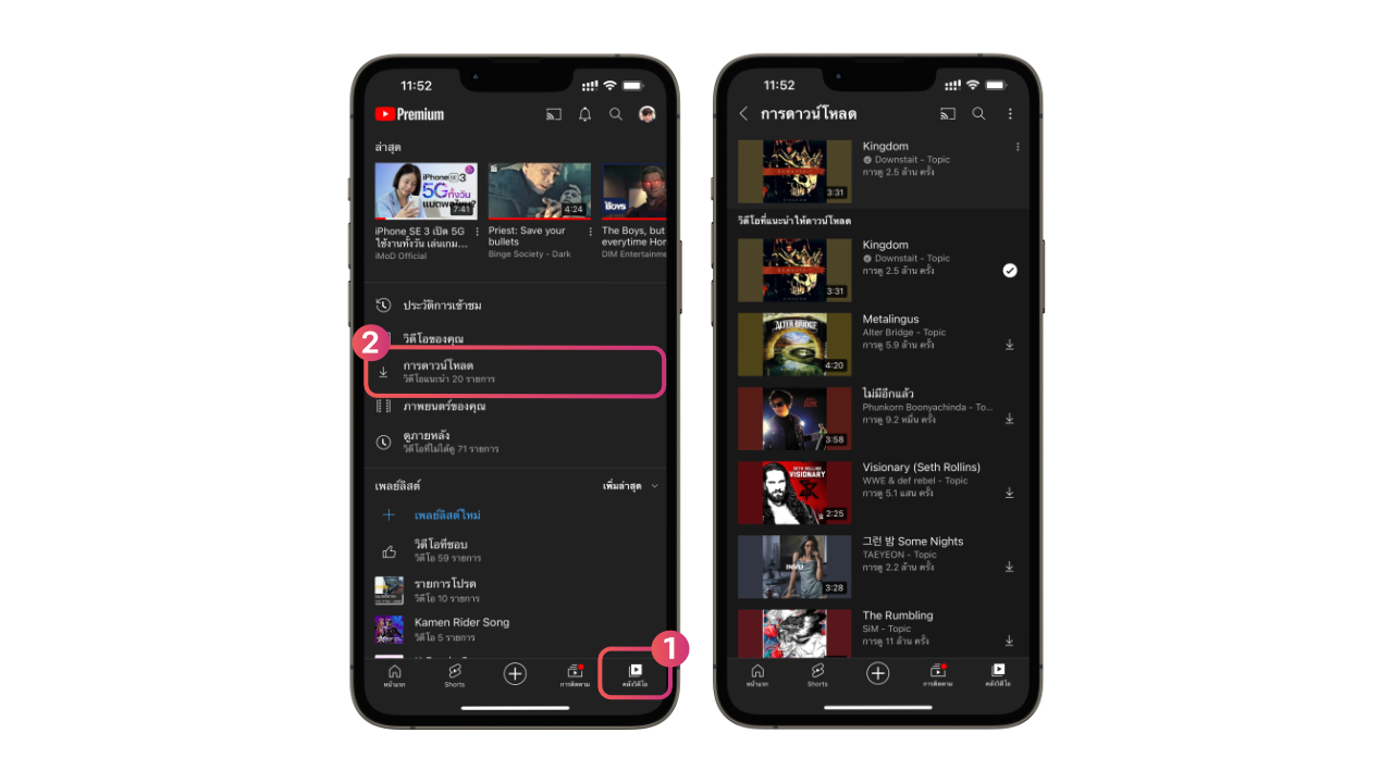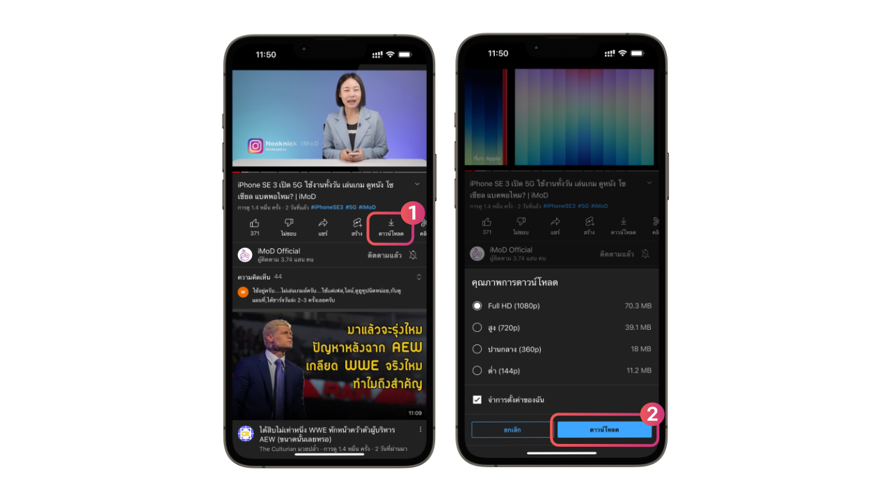 เปิดแอป Youtube ขึ้นมา จากนั้นก็เลือกวิดีโอที่ต้องการดาวน์โหลด > แตะ “ดาวน์โหลด” > จะมีป๊อปอัพให้เลือก “คุณภาพการดาวน์โหลด” > เมื่อเลือกเสร็จวิดีโอจะถูกย้ายไปอยู่ในคลังดาวน์โหลด > รอดาวน์โหลดจนเสร็จ > ดูแบบออฟไลน์ได้เลย