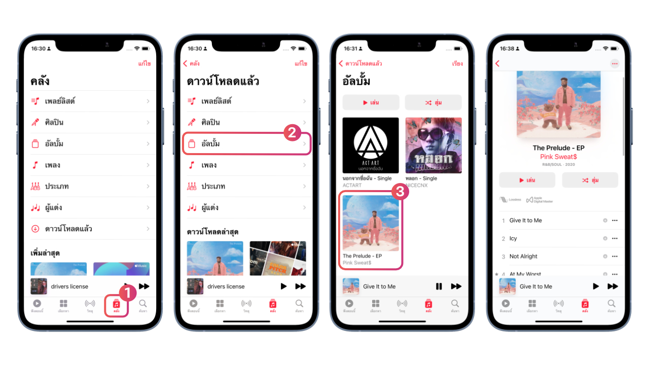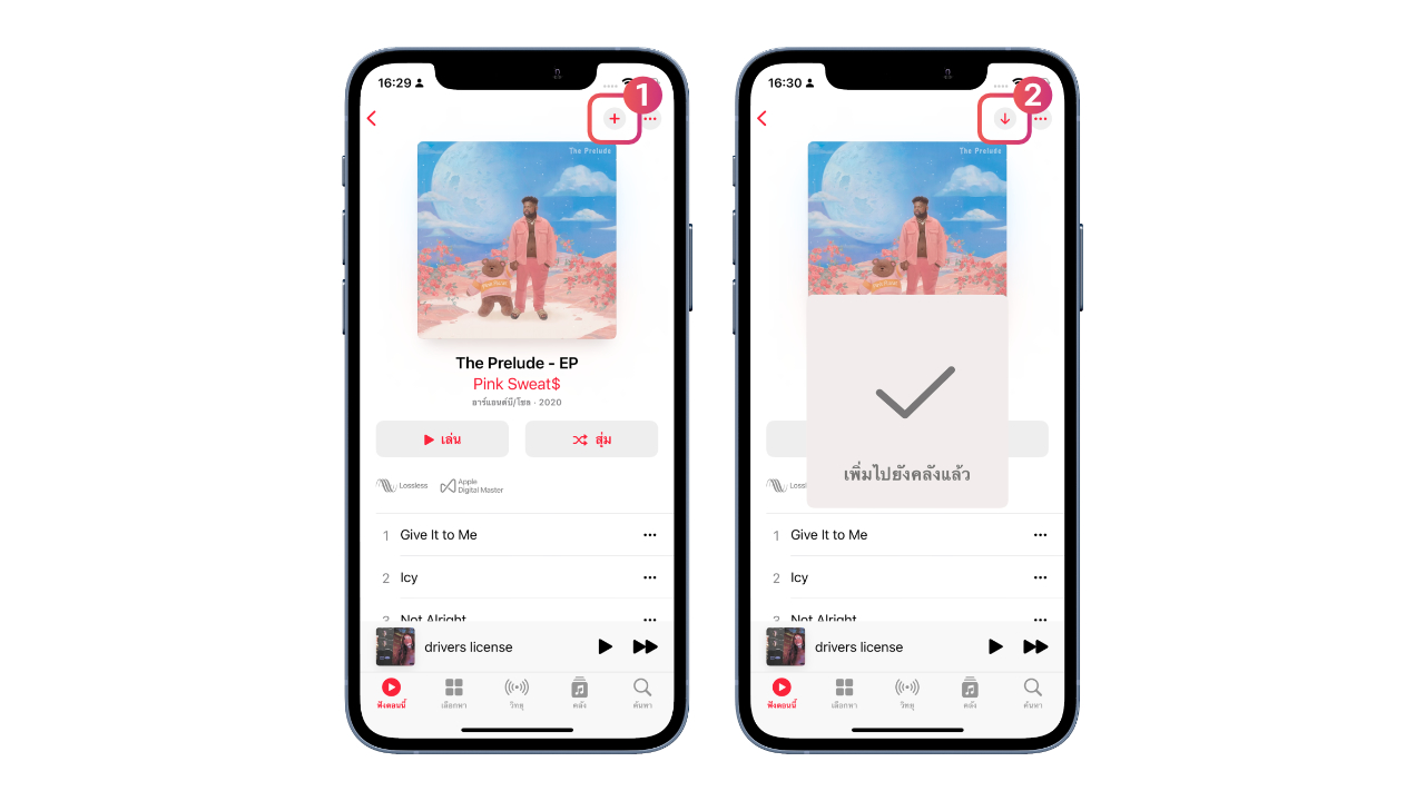 สำหรับเพลงที่อยู่ใน Apple Music นั้นจะต้องเพิ่มเพลงเข้าคลังก่อนถึงจะสามารถดาวน์โหลดเพลงไว้ฟังแบบออฟไลน์ได้ ขั้นตอนแรกให้ไปที่แอป Apple Music > เลือกเพลงที่เราต้องการ > แตะ “เครื่องหมายบวก” มุมบนขวาเพื่อเพิ่มเพลงเข้าคลัง หลังจากเพิ่มเพลงเข้าคลังจะมีลูกศรดาวน์โหลดแสดงขึ้น > แตะลูกศรดาวน์โหลด > จากนั้นให้รอจนกว่าจะดาวน์โหลดเพลงเสร็จ > ฟังเพลงแบบออฟไลน์ได้เลย