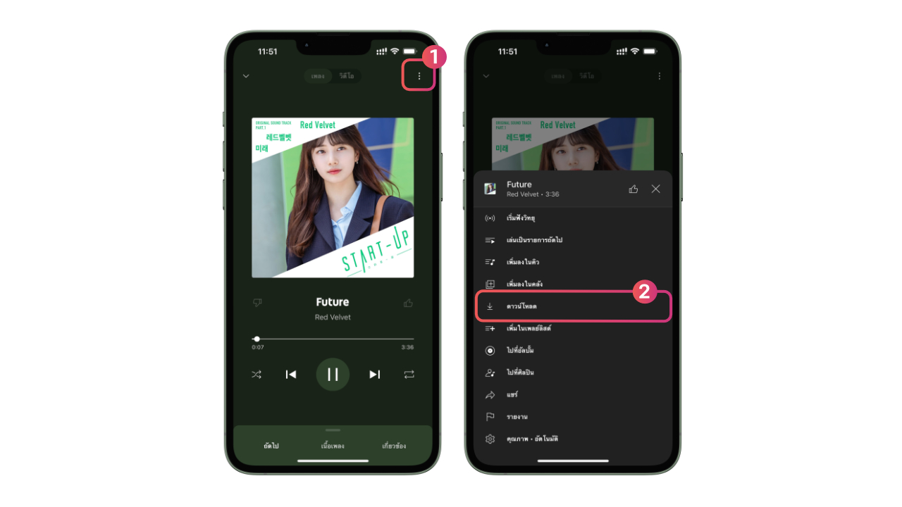 เปิดแอป Youtube Music ขึ้นมา จากนั้นก็เลือกเพลงที่ต้องการดาวน์โหลด > แตะที่จุดสามจุดมุมบนขวา > แตะที่ “ดาวน์โหลด” > รายการเพลงทั้งหมดจะถูกย้ายไปที่คลังเพลง
