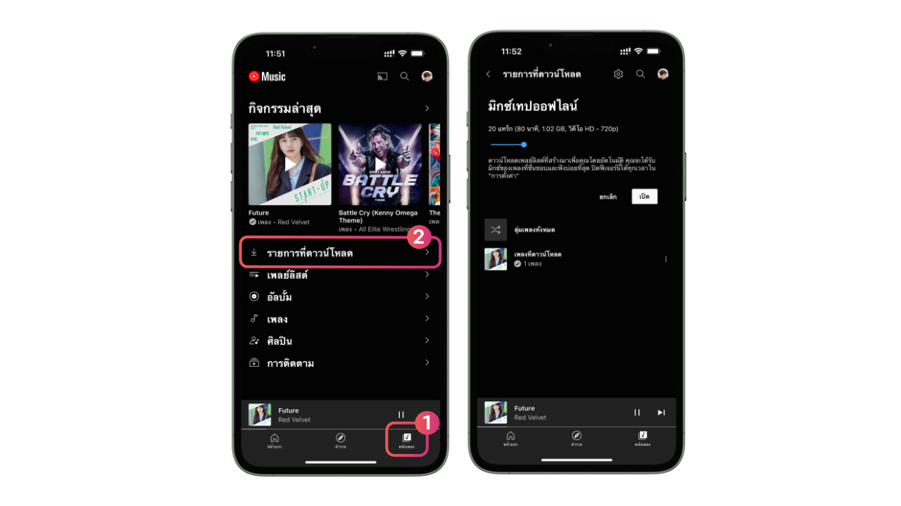 สามารถเข้าไปดูรายการเพลงที่ดาวน์โหลดไว้ได้ โดยแตะที่ “คลังเพลง” ที่แถบเมนูด้านล่าง > เลือก “รายการที่ดาวน์โหลด” > ก็จะมีเพลงที่ดาวน์โหลดไว้ปรากฎขึ้นมา