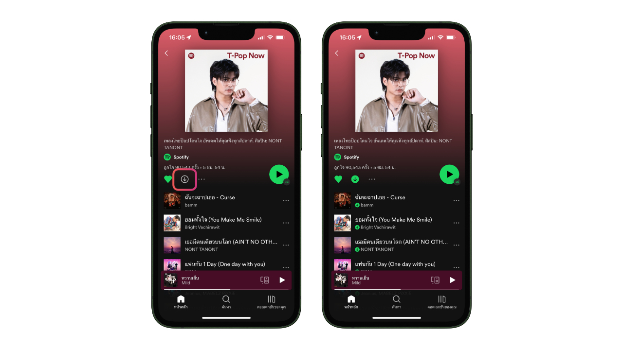 ขั้นตอนแรกให้ไปที่แอป Spotify > เลือกเพลงที่เราต้องการดาวน์โหลดเก็บไว้ฟังแบบออฟไลน์ > แตะที่ลูกศรดาวน์โหลด > รายการเพลงทั้งหมดจะถูกย้ายไปที่คลังเพลง
