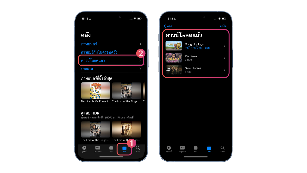 ถ้าหากเราปิด Wi-Fi หรือปิดเซลลูลาร์ไว้ ภาพยนตร์/ซีรีส์ที่ดาวน์โหลดเสร็จแล้ว ก็จะถูกเพิ่มเข้าไปในคลัง > รายการ “ดาวน์โหลดแล้ว” จากนั้นก็สามารถเลือกรับชมได้เลย