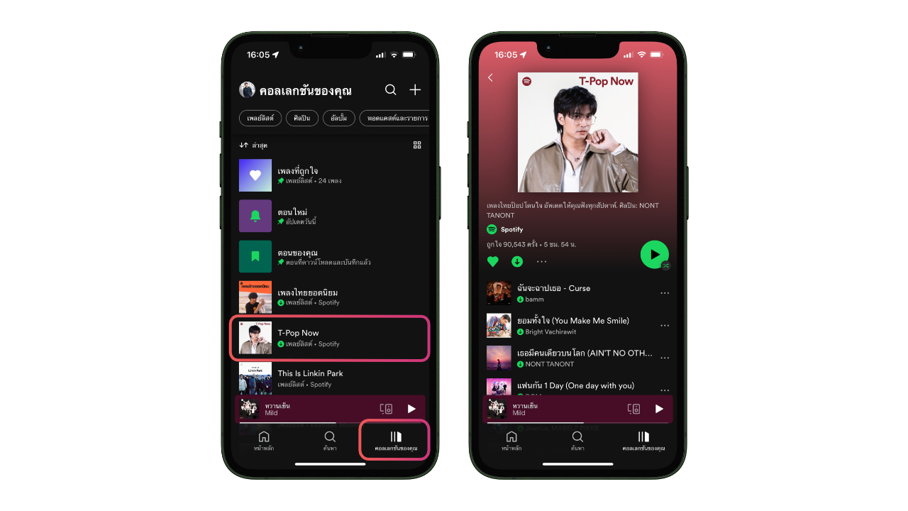 สามารถเข้าไปดูรายการเพลงที่ดาวน์โหลดไว้ได้ โดยแตะที่ “คอลเลกชันของคุณ” ที่แถบเมนูด้านล่างก็จะมีเพลย์ลิสต์เพลงที่เรากดดาวน์โหลดไว้ปรากฎขึ้นมา เพียงเท่านี้ก็ฟังเพลงแบบออฟไลน์ได้แล้ว
