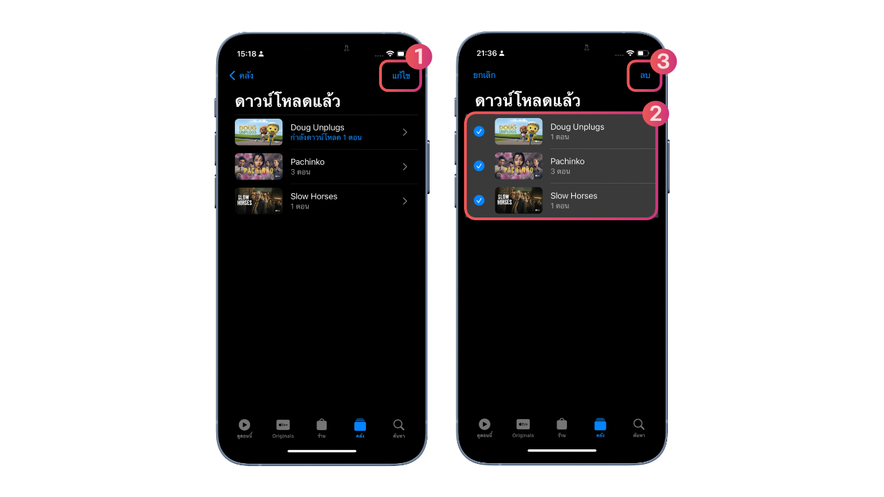 เมื่อเราดูจนจบแล้วก็สามารถลบรายการดาวน์โหลดได้ โดยแตะที่ “แก้ไข” > เลือกวิดีโอที่ต้องการลบ > แตะ “ลบ”