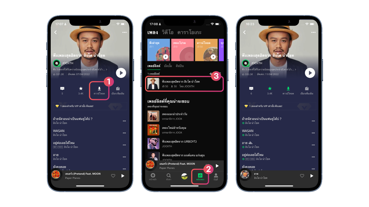วิธีการฟังเพลงแบบออฟไลน์ ให้แตะที่ “คลังเพลง” ที่แถบเมนูด้านล่าง ก็จะมีเพลย์ลิสต์เพลงที่เรากดดาวน์โหลดไว้ปรากฎขึ้นมา เพียงเท่านี้ก็จะสามารถฟังเพลงแบบออฟไลน์ได้แล้ว