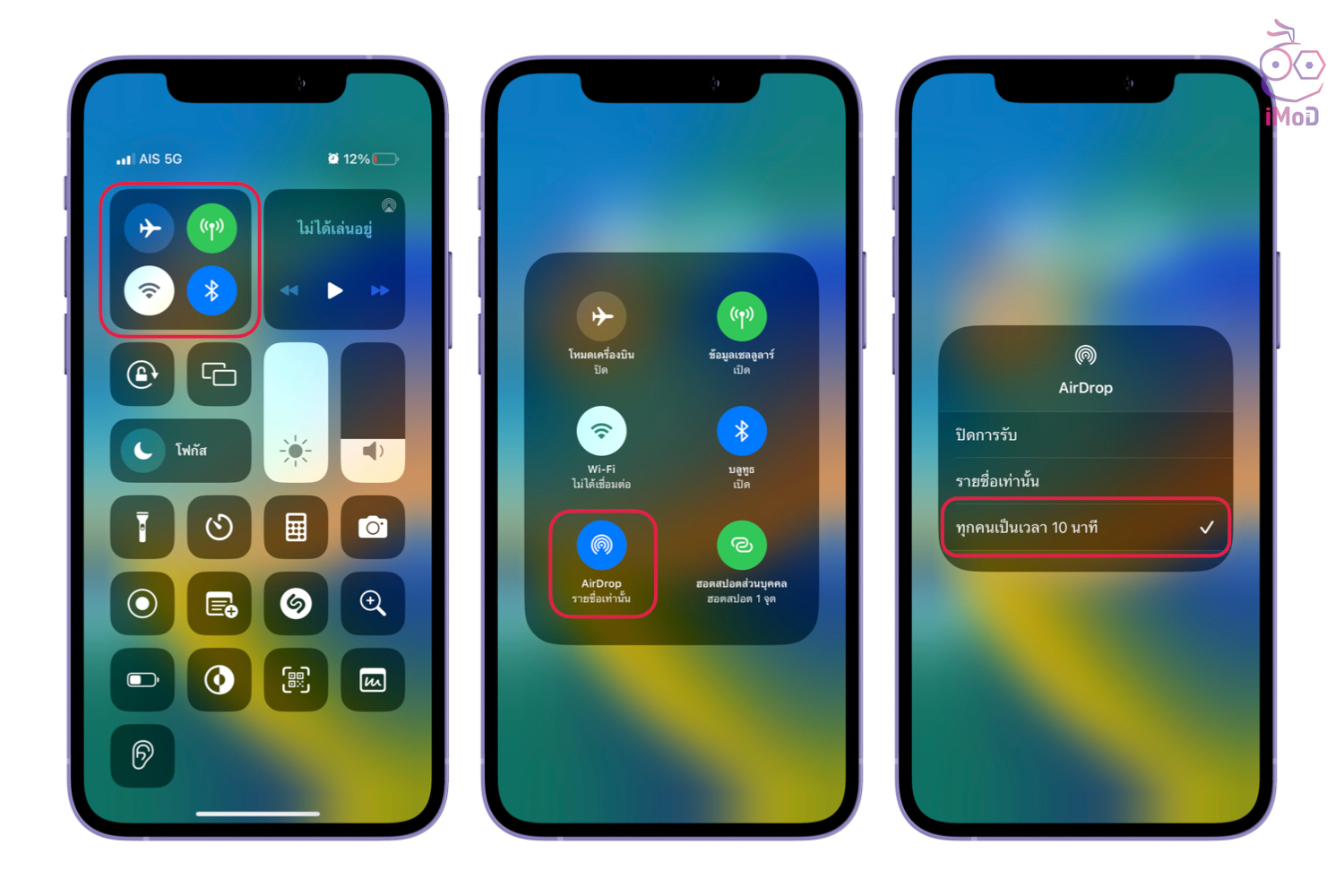 วิธีแรก ทุกคนคงจะคุ้นเคยกันดีอยู่แล้ว สำหรับการเปิดใช้งาน AirDrop เราสามารถเปิด Control Center ขึ้นมา จากนั้นก็แตะส่วนของการเชื่อมต่อค้างไว้ > แล้วเลือกไอคอน AirDrop ค้างไว้ > เลือกตัวเลือก ทุกคนเป็นเวลา 10 นาที (Everyone for 10 minutes)