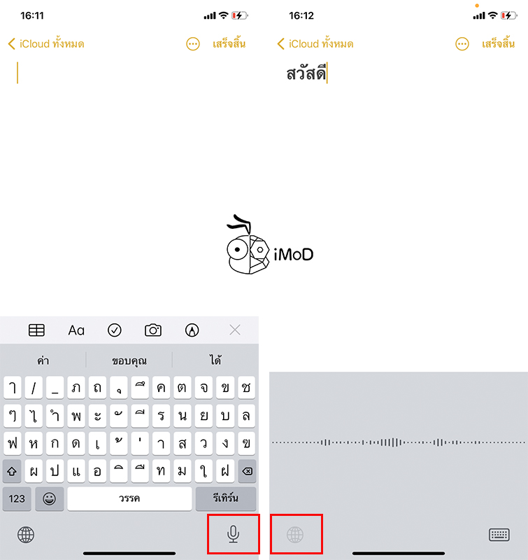 เมื่อเปิดใช้งานแล้ว เวลาที่เรียกใช้งานคีย์บอร์ด เราจะเห็นไอคอนรูปไมโครโฟนแสดงขึ้นมา ให้แตะที่ไอคอน แล้วก็พูดในสิ่งที่ต้องการ คีย์บอร์ดก็จะแสดงข้อความตามที่เราพูด ซึ่งรองรับภาษาไทยด้วย หากต้องการเปลี่ยนภาษาระหว่างพูด ก็สามารถแตะไอคอนรูปโลกเพื่อสลับไปยังภาษาอื่นได้เลย