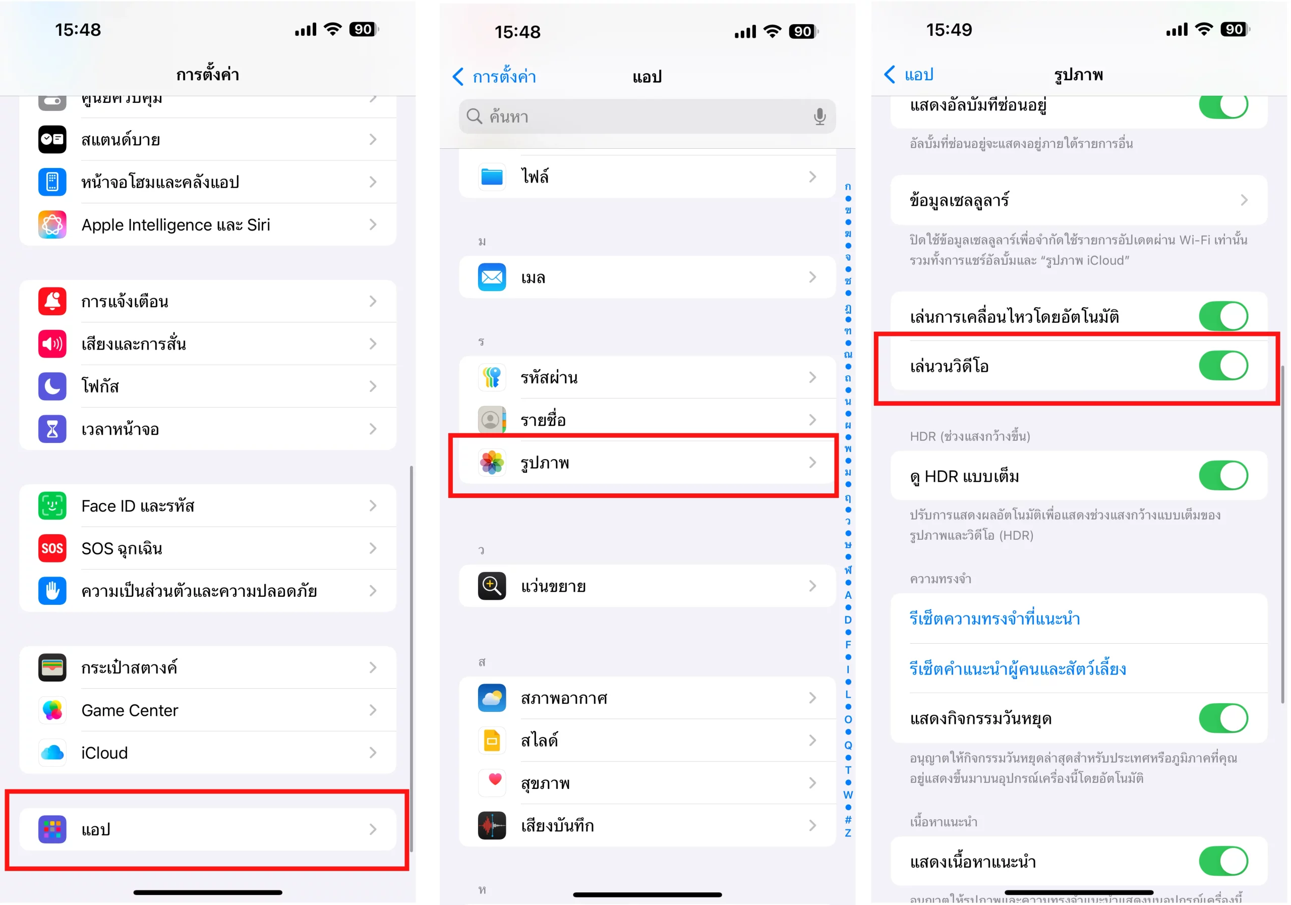 ไปที่การตั้งค่า > แอป > รูปภาพ > เลื่อนเปิด “เล่นวนวิดีโอ”
