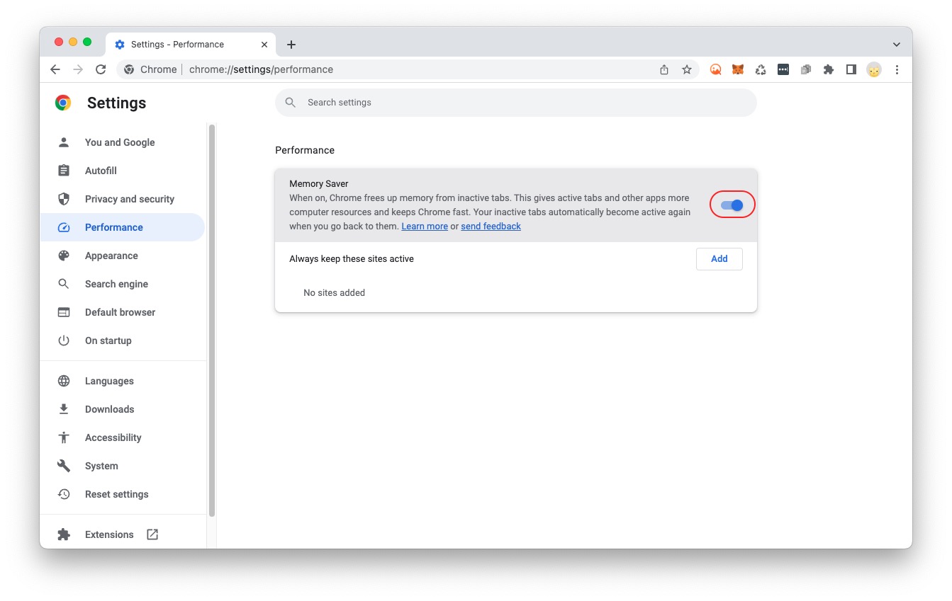 จากนั้นให้คัดลอก chrome://settings/performance ไปวางที่ช่อง URL ใน Chrome แล้วเปิดใช้งาน Memory Saver > จากนั้นก็รีสตาร์ตแอป Chrome ด้วยการปิดและเปิดใหม่