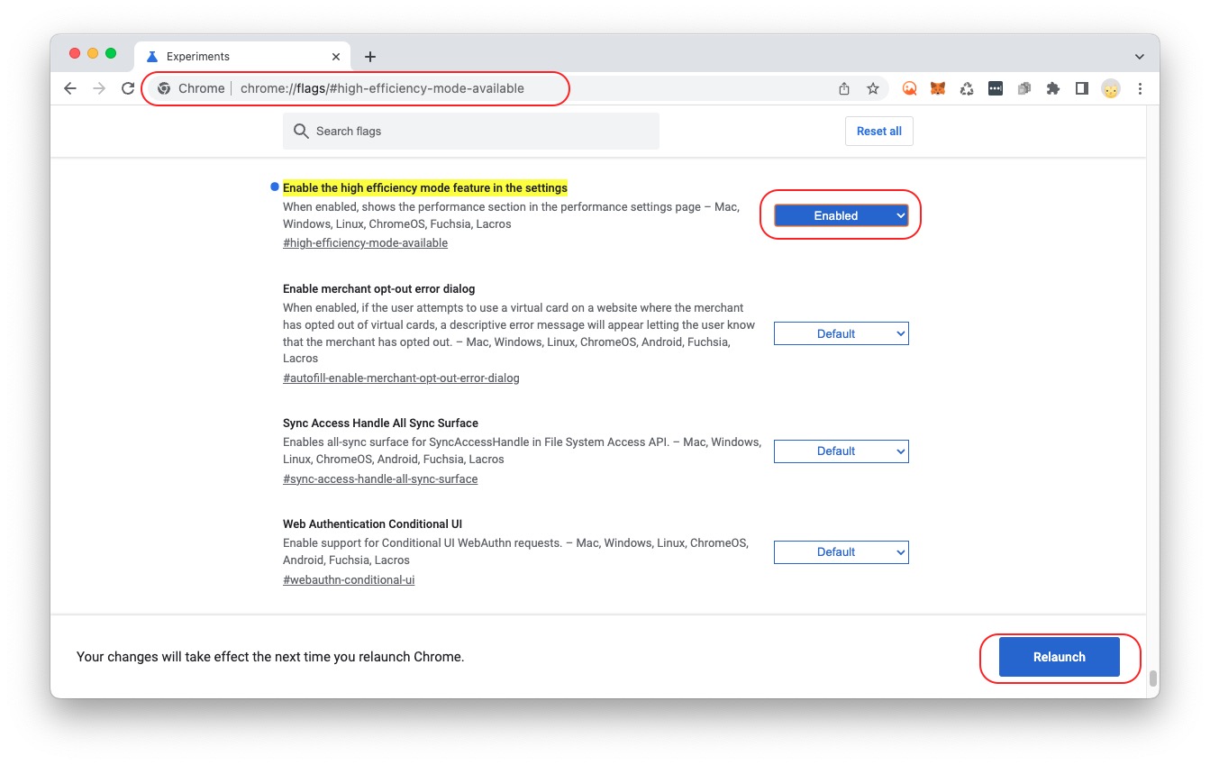 ก่อนอื่นให้เราอัปเดต Chrome ให้เป็นเวอร์ชันล่าสุดให้เรียบร้อย จากนั้นให้คัดลอก chrome://flags/#high-efficiency-mode-available ไปวางที่ช่อง URL ใน Chrome > ตั้งค่า chrome://settings/performance ให้เป็น Default > คลิก Relaunch เพื่อรีสตาร์ต Chrome ใหม่
