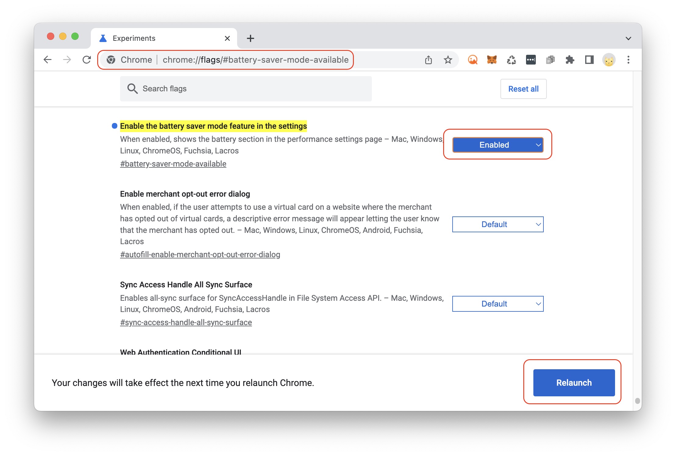 โดยคัดลอก chrome://flags/#battery-saver-mode-available ไปวางที่ช่อง URL > เลือก Enable > คลิก Relaunch เพื่อเปิด Chrome ใหม่