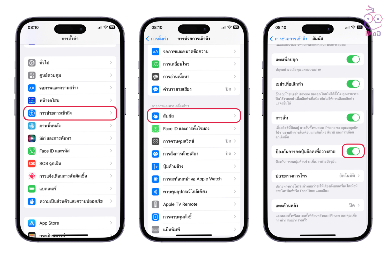 ไปที่ การตั้งค่า (Setting) > การช่วยการเข้าถึง (Accessibility) > สัมผัส (Touch) > เปิด ป้องกันการกดปุ่มล็อกเพื่อวางสาย (Prevent Lock to End Call)
