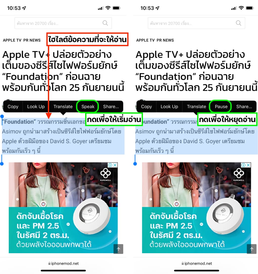 ในตอนที่เราเปิดใช้ฟีเจอร์นี้แล้ว เมื่อเราไฮไลต์ข้อความ จะมีปุ่มอ่านออกเสียงแสดงขึ้นมา ใก้กดที่คำว่า “Speak” เพื่อให้เราสั่งให้ Siri อ่านออกเสียงสิ่งที่เลือกไว้ หรือกด “Pause” เพื่อสั่งให้หยุดอ่านเนื้อหา