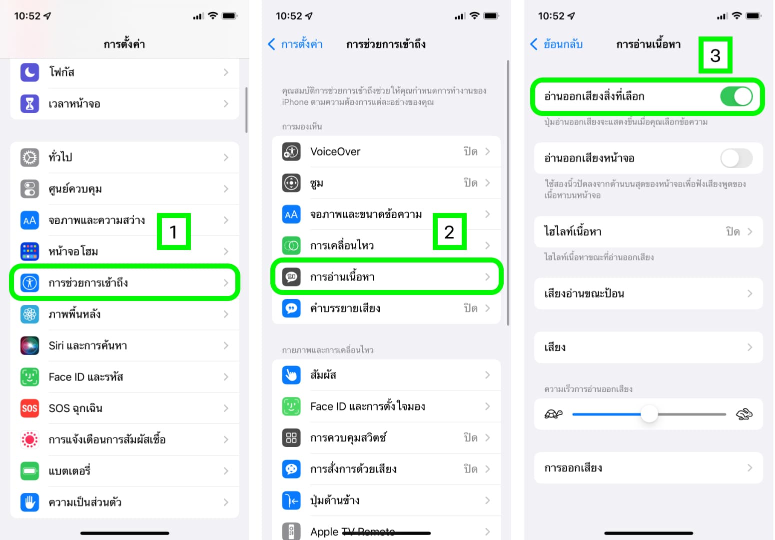 ไปที่การตั้งค่า > การช่วยการเข้าถึง > การอ่านเนื้อหา > เลื่อนเปิด “อ่านออกเสียงสิ่งที่เลือก”