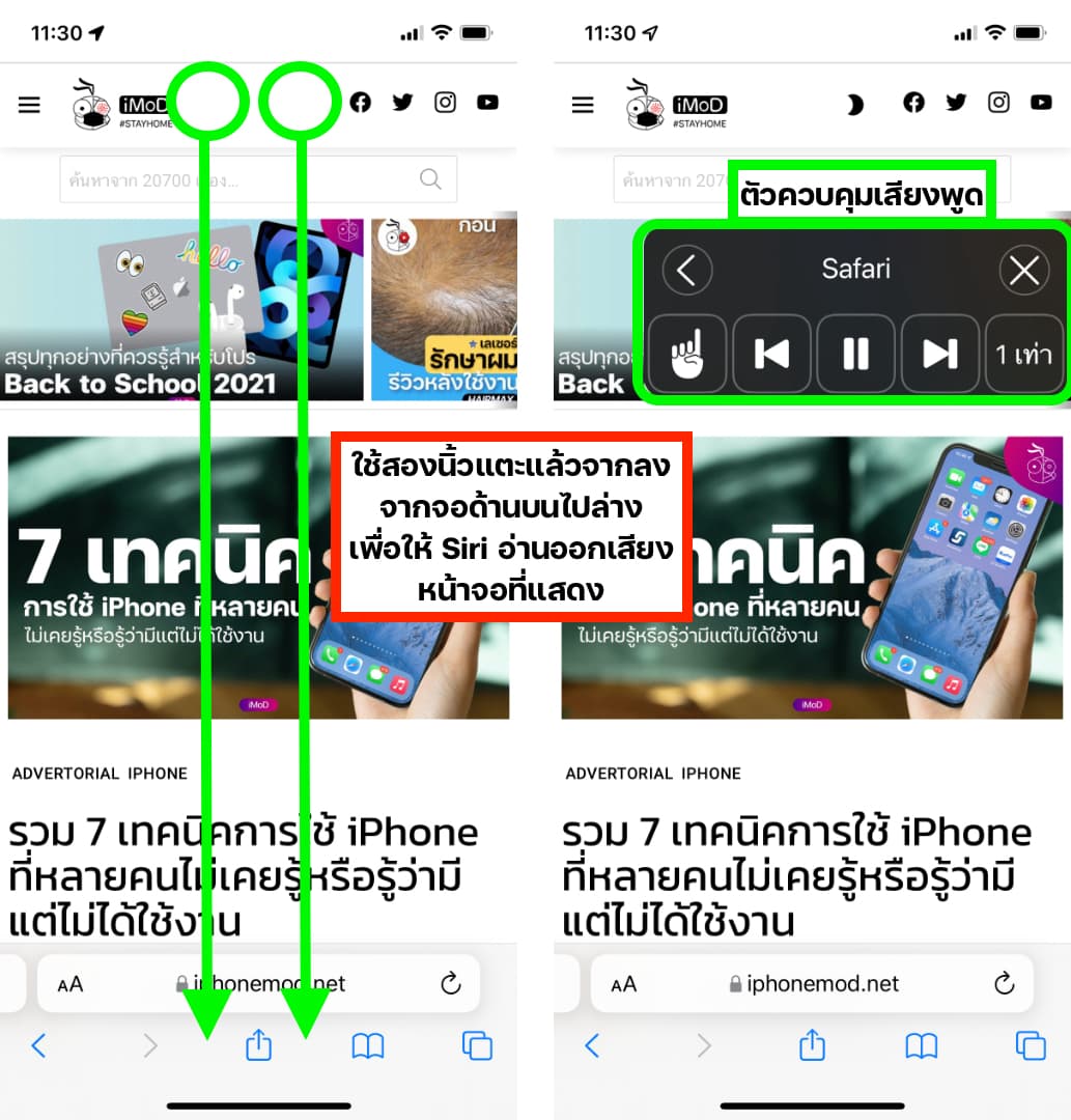 ส่วนวิธีการทำให้ Siri อ่านออกเสียงหน้าจอ ให้ใช้ 2 นิ้วลากจากจอด้านบนไปด้านล่าง จากนั้น Siri ก็จะอ่านออกเสียงให้ฟัง และจะมีตัวควบคุมเสียงพูดเด้งขึ้นมาให้ใช้งาน